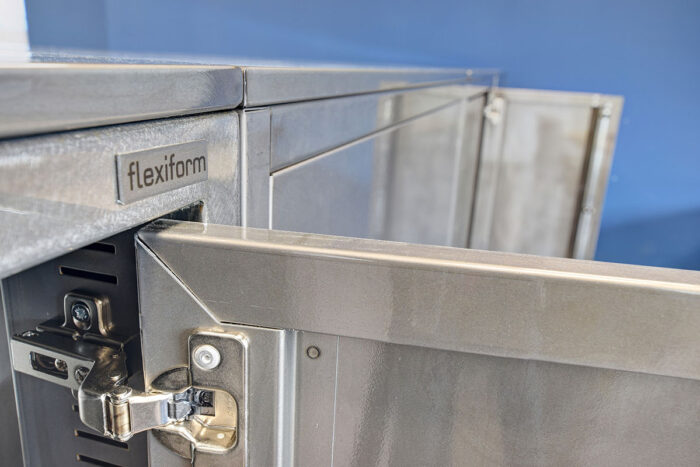 In keeping with the brief, Flexiform’s Ferro hinged door storage units were also selected for the project, with the clear lacquered finish adding a sturdy factory-like feel to the installation. The office storage units were installed with plain shelving, giving the staff maximum flexibility to store paperwork to product samples. All our storage was finished by a Flexiform metal product tag to keep with the tone and feel of the range.