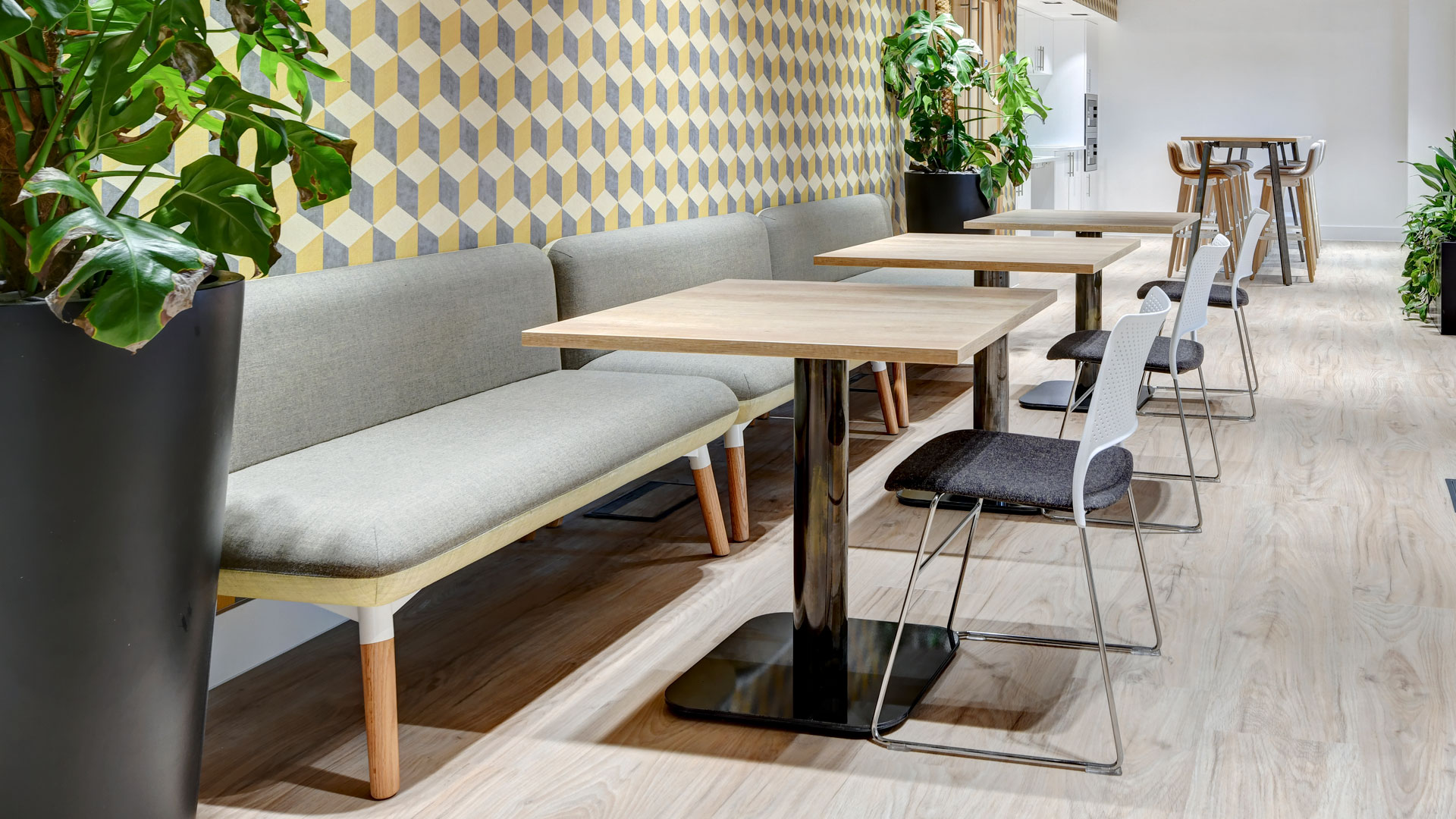 Within the collaborative and flexible workspaces, we created numerous breakout, meeting and private working areas for 1-6 people. Individual pods (both solo work booths and telephone booths) enable staff to make private calls or work individually within the main office area. Open breakout spaces were all created using existing office sofas, 4-person meeting booths and lounge chairs. This created a range of semi-private informal meeting and breakout areas for all staff to use.