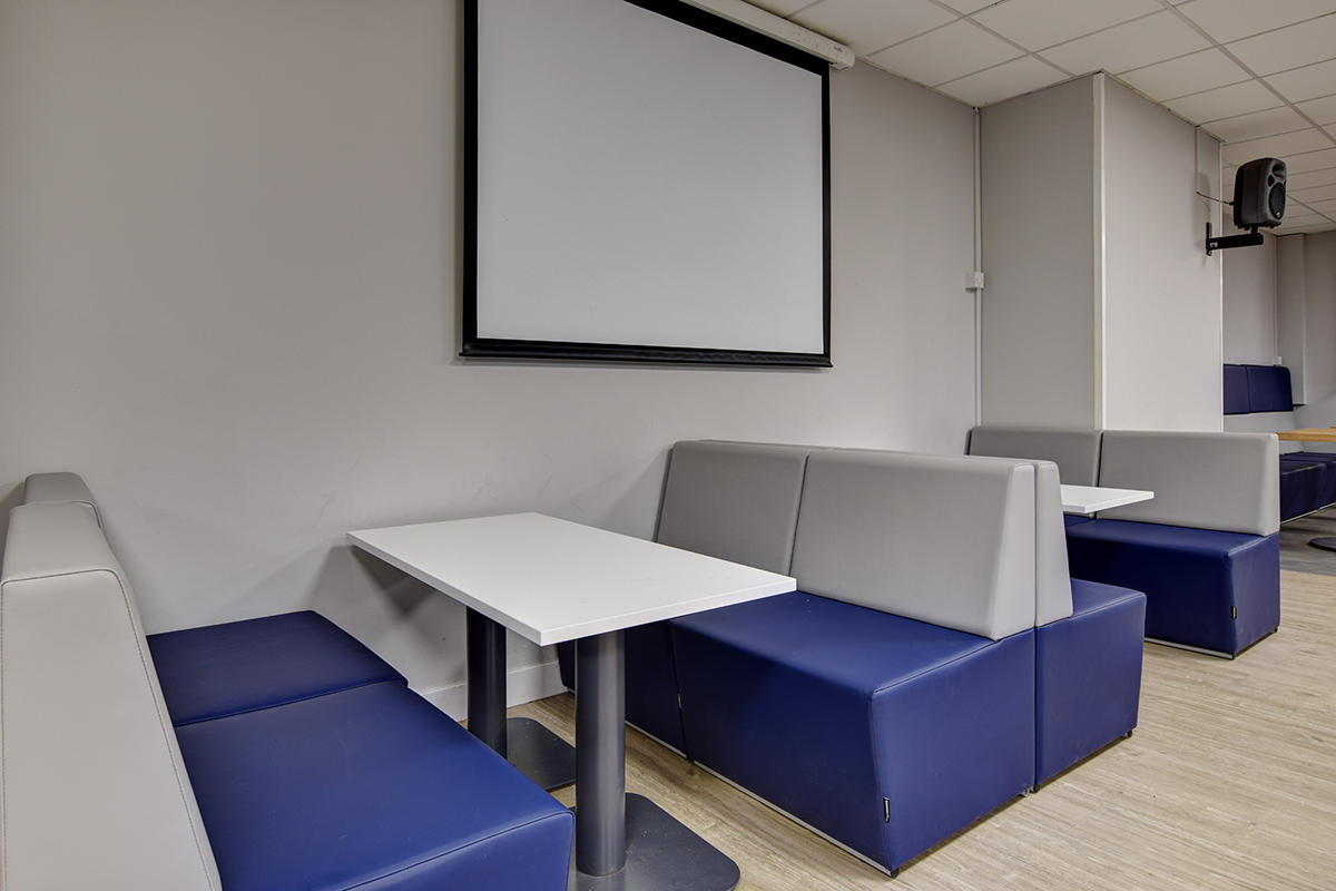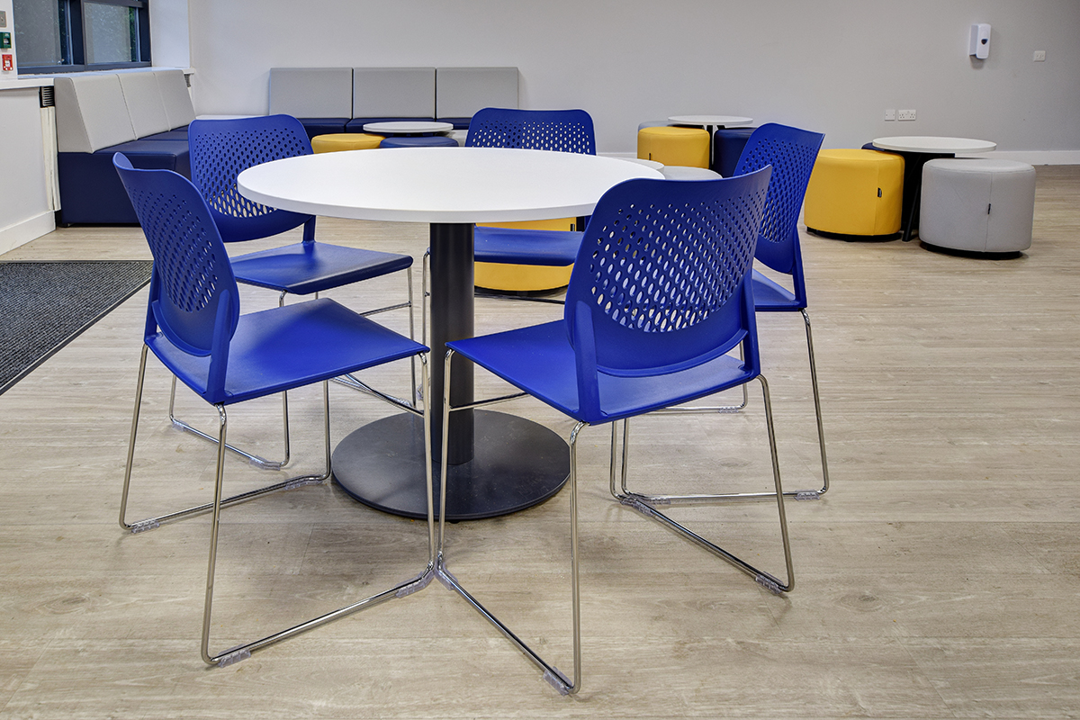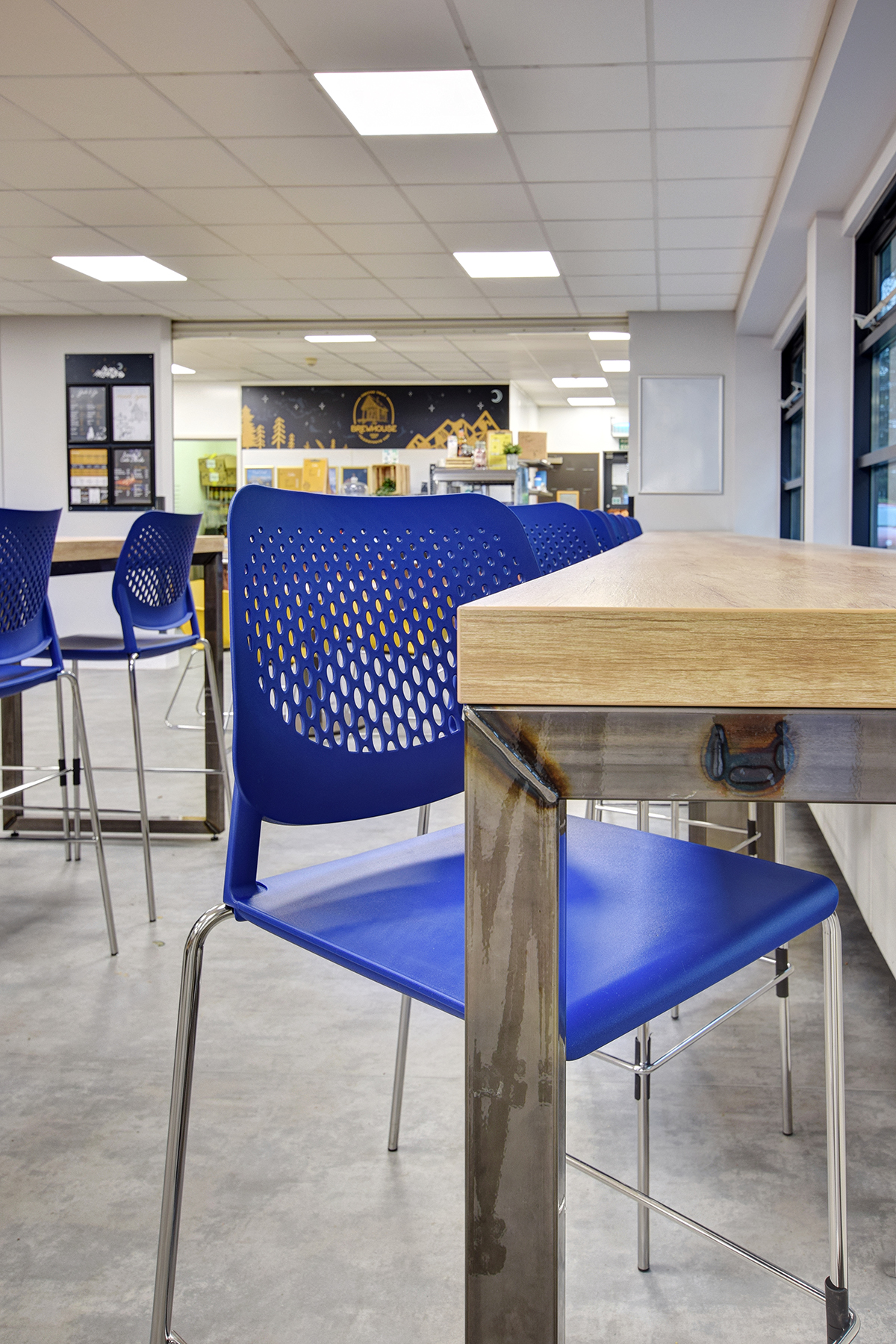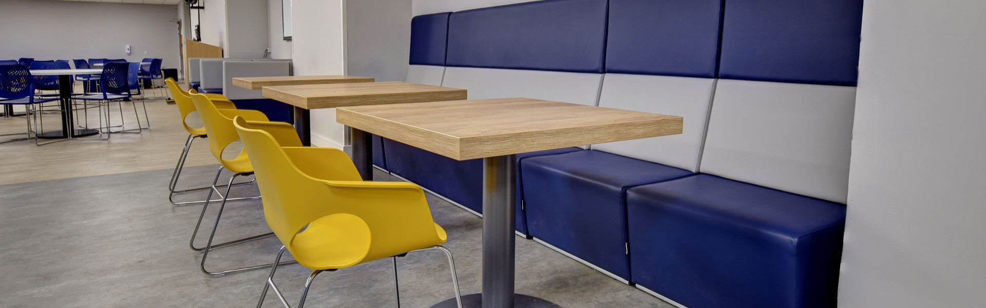 With the other half of the canteen, we installed a range of canteen furniture with banquette seating, Ferro industrial style bench tables, One-shot stools and Olé mono-shell tub chairs, carrying through the design in both parts of the breakout space with a mixture of blues, greys and yellows. Each piece of contract furniture was picked for its durability, providing a hard-wearing space designed for students and dining.