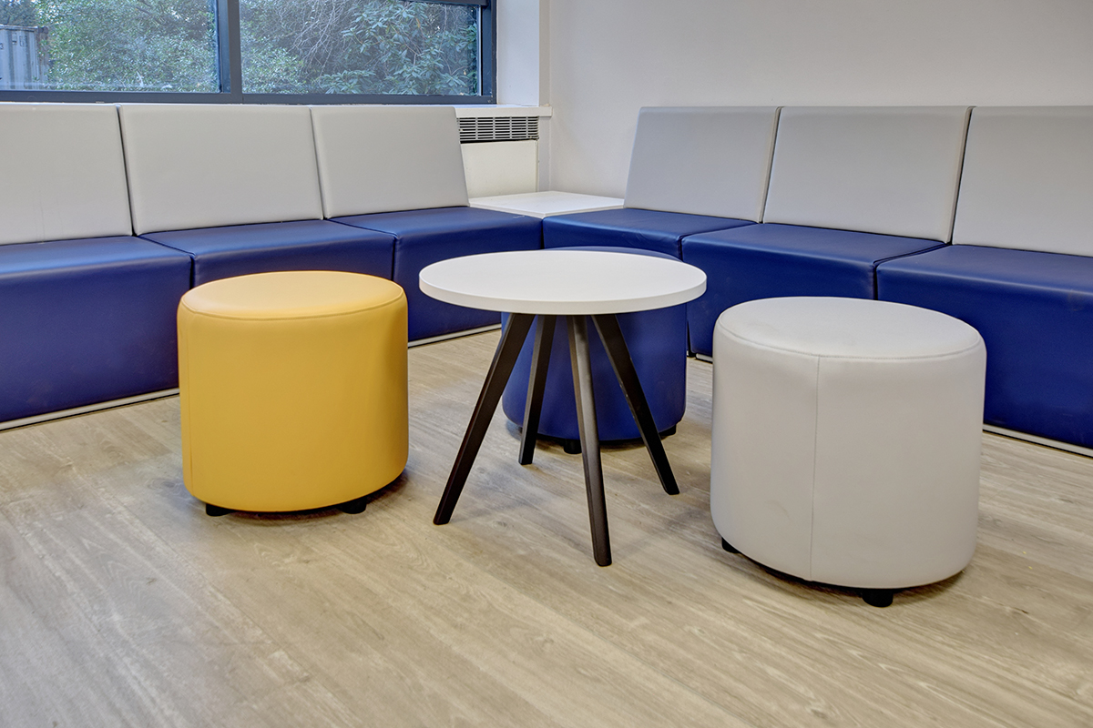 When designing the 6th formers canteen and breakout space, one of Collingwood Colleges’ main criteria was to feature a reconfigurable area to allow the use of a retractable screen. Designer Lucie Carr and education specialist Dan Clark pitched the idea of using our One-shot stacking chairs and low stools/pouffes to allow the space to easily transform from group breakout/ dining to rows of seating. All the coffee tables, chairs and pouffes within this space are light and easily movable with the fixed modular sofa at the back designed to suit both set-ups.