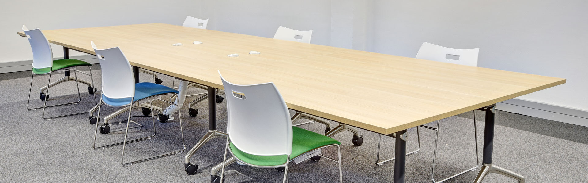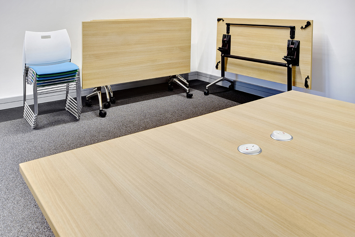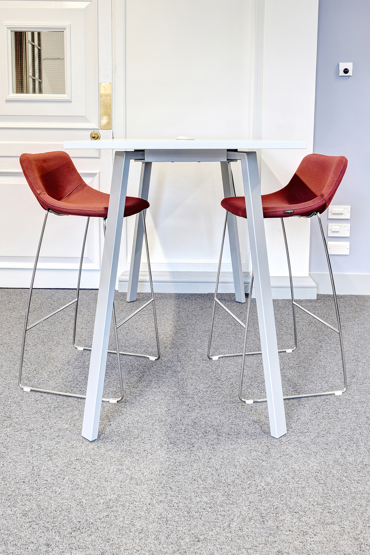 Our Additions silver pedestal tables in the collaboration area are in line with the chrome wired chairs, allowing staff to come together for projects and meetings. The Additions 2 poseur height meeting table and stools are perfect for quick team huddles and are fitted with power and data modules, allowing staff to bring their laptops with them.