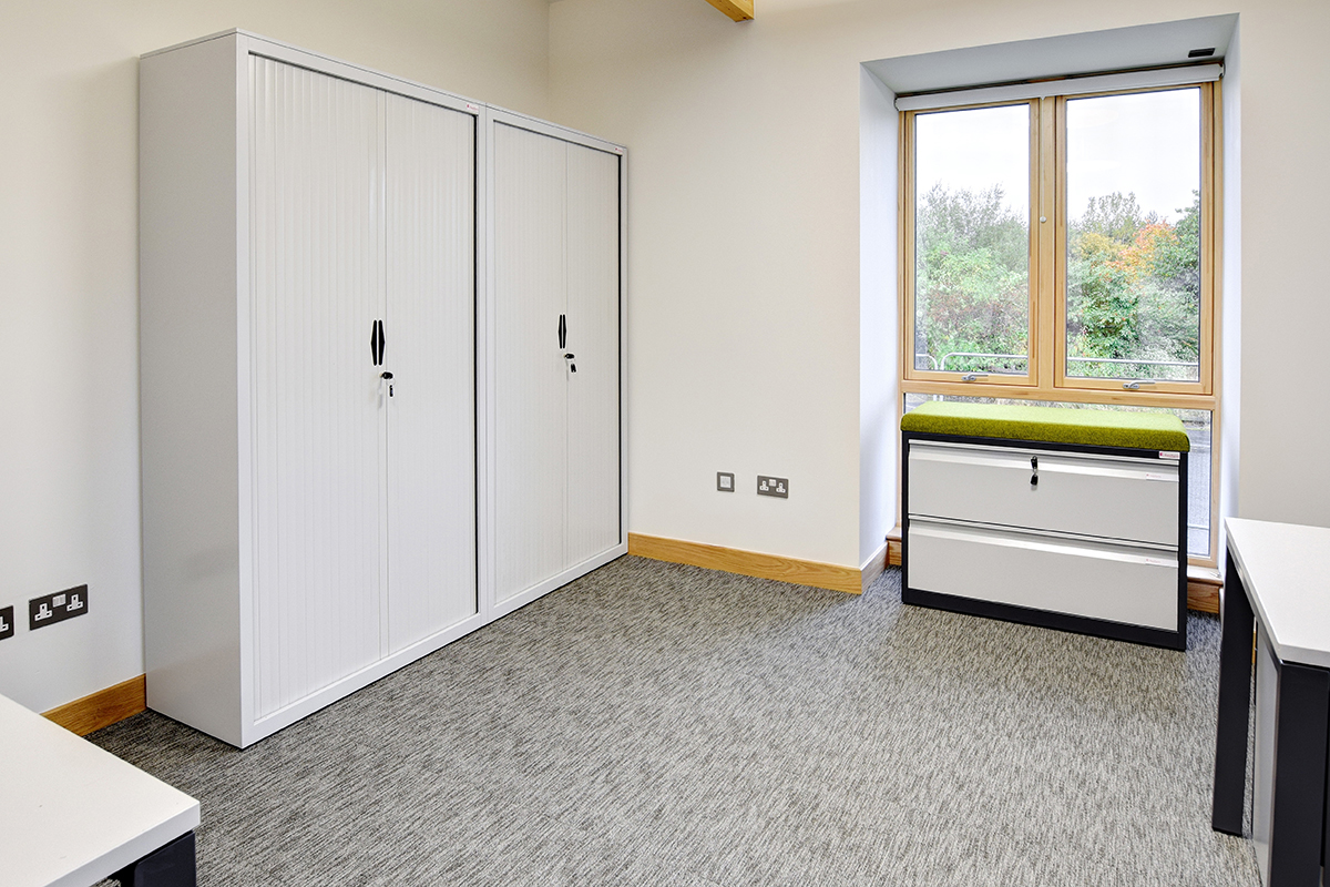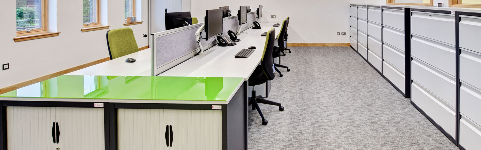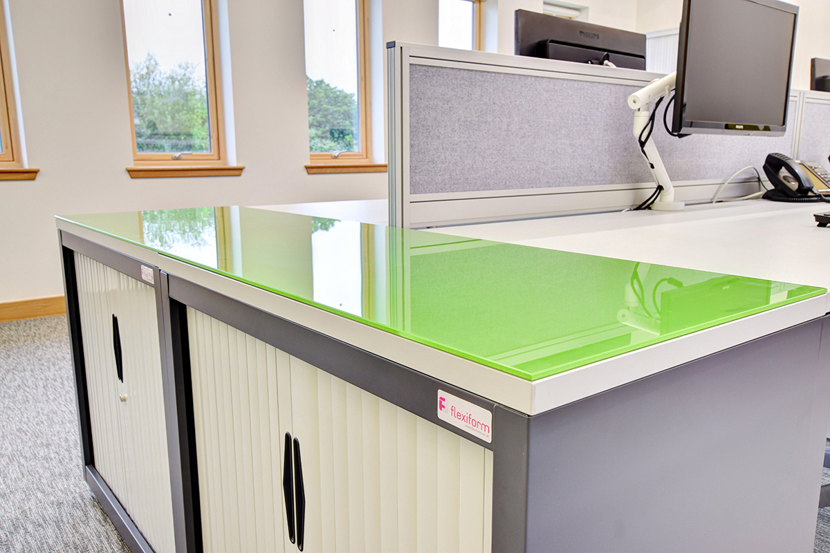 After providing initial visual concepts and layouts, Flexiform completed a storage survey to determine the specific requirements for Donaldson Timber’s new office building. In order to complement the natural wood finishes and exposed beams in the office, vibrant green fabrics were selected as a feature colour to create a subtle earthy feel. A variety of textures and finishes throughout the office complement this core aesthetic, with white and grey metalwork, hardwood flooring, muted carpets and even a reflective glass worktop combined to create a clean, contemporary look.