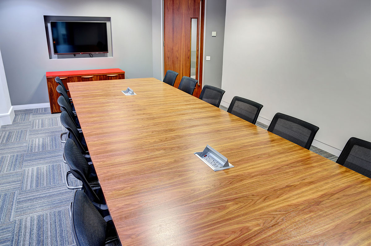 In the boardroom, we incorporated walnut veneer table tops with silver electronics, to create a luxury executive feel. A functional and minimal cantilever chair was supplied to complement the desk.