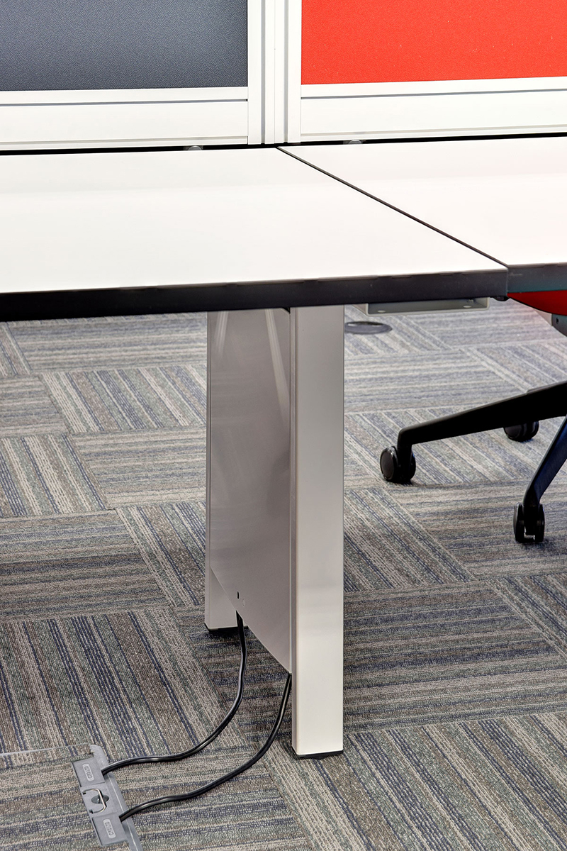 Flexiform installed Pico desks bring a clean, smart aesthetic, while also being very versatile and functional. Pico desks have built-in cable management, keeping office space neat and tidy, with access to wires through a convenient sliding top. The range can also have desk-mounted screens attached, which don’t limit the sliding top function or eat into desk space. As seen in the images, the screens can be finished in differently-coloured fabrics to create a bright, colourful workspace.