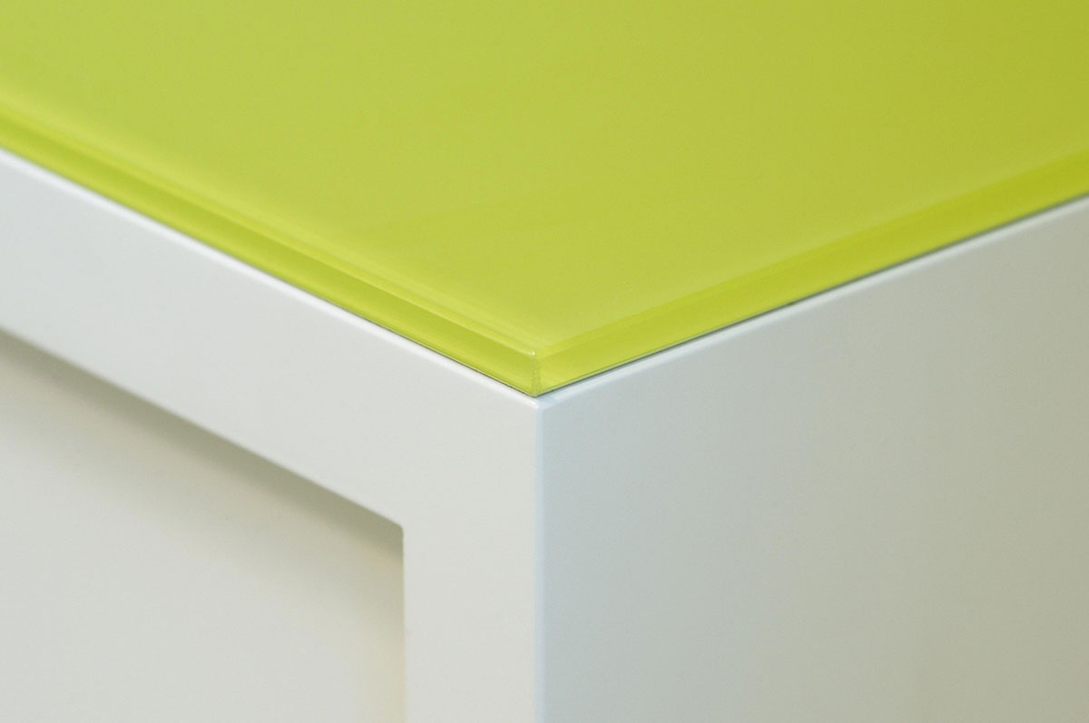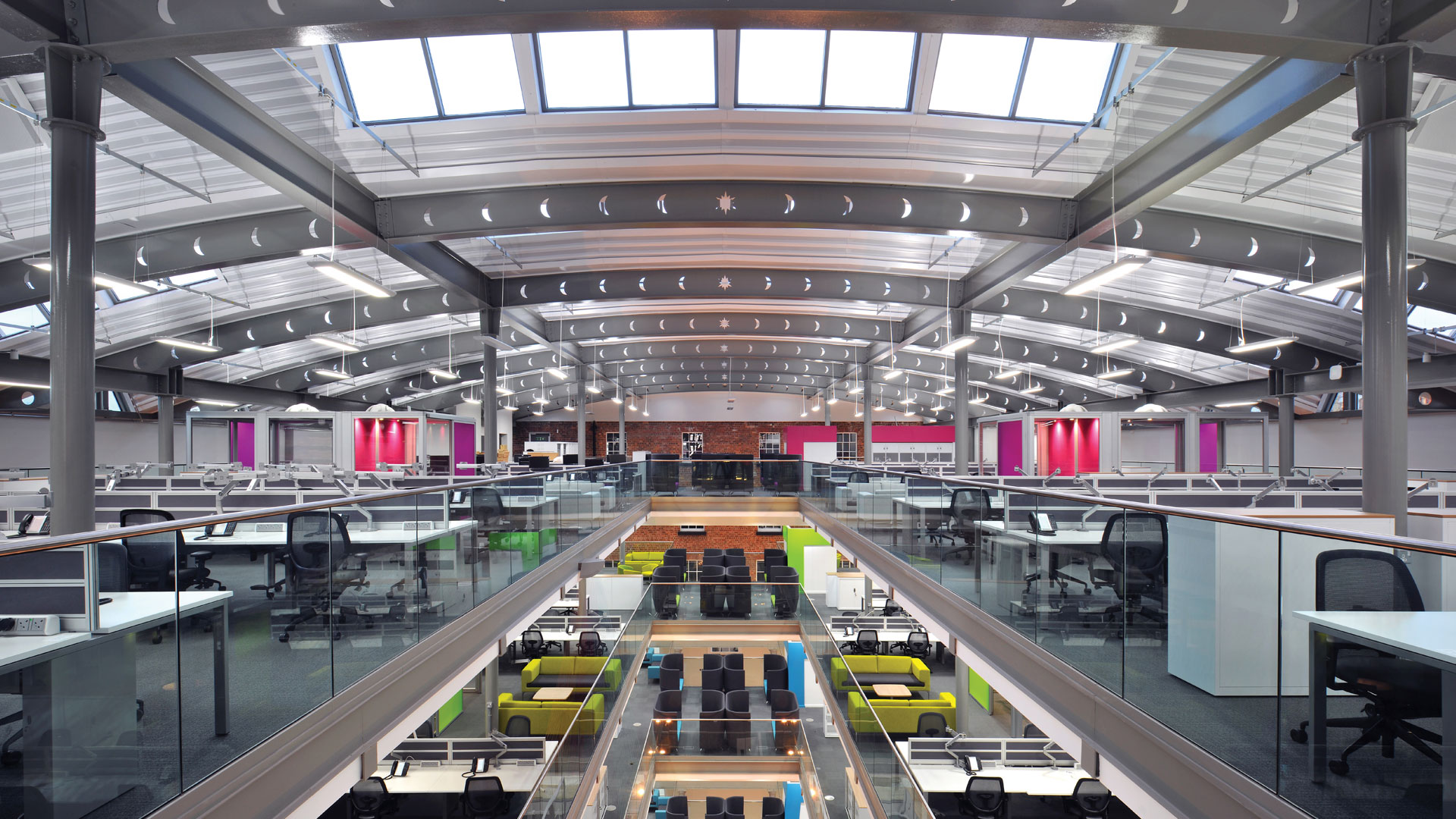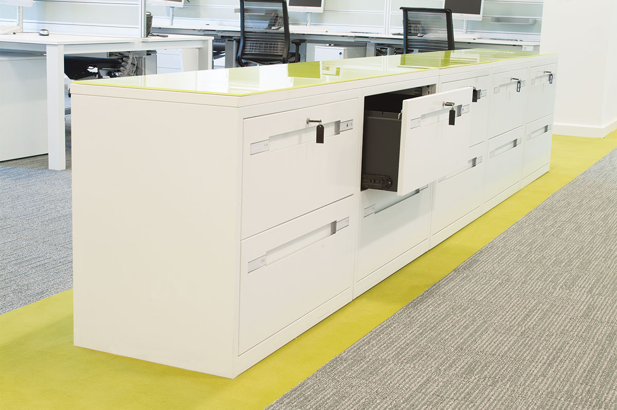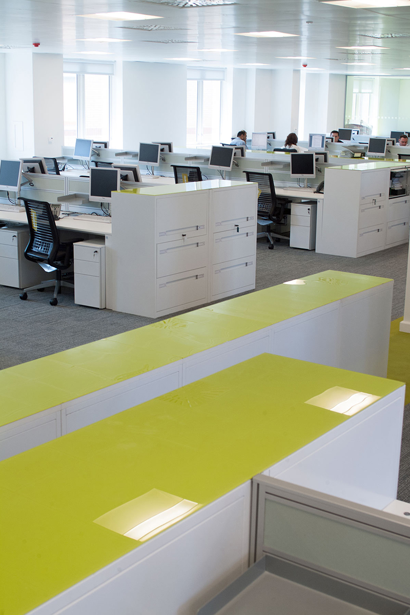 The interiors followed two colour themes; the main workspaces are white, complemented with a lime green finish, with surrounding storage in white. A variety of lime green glass was used with Jot to add a striking colour theme, which matched chairs and carpets throughout the building. Reception, meeting and breakout spaces were finished in white and lilac.