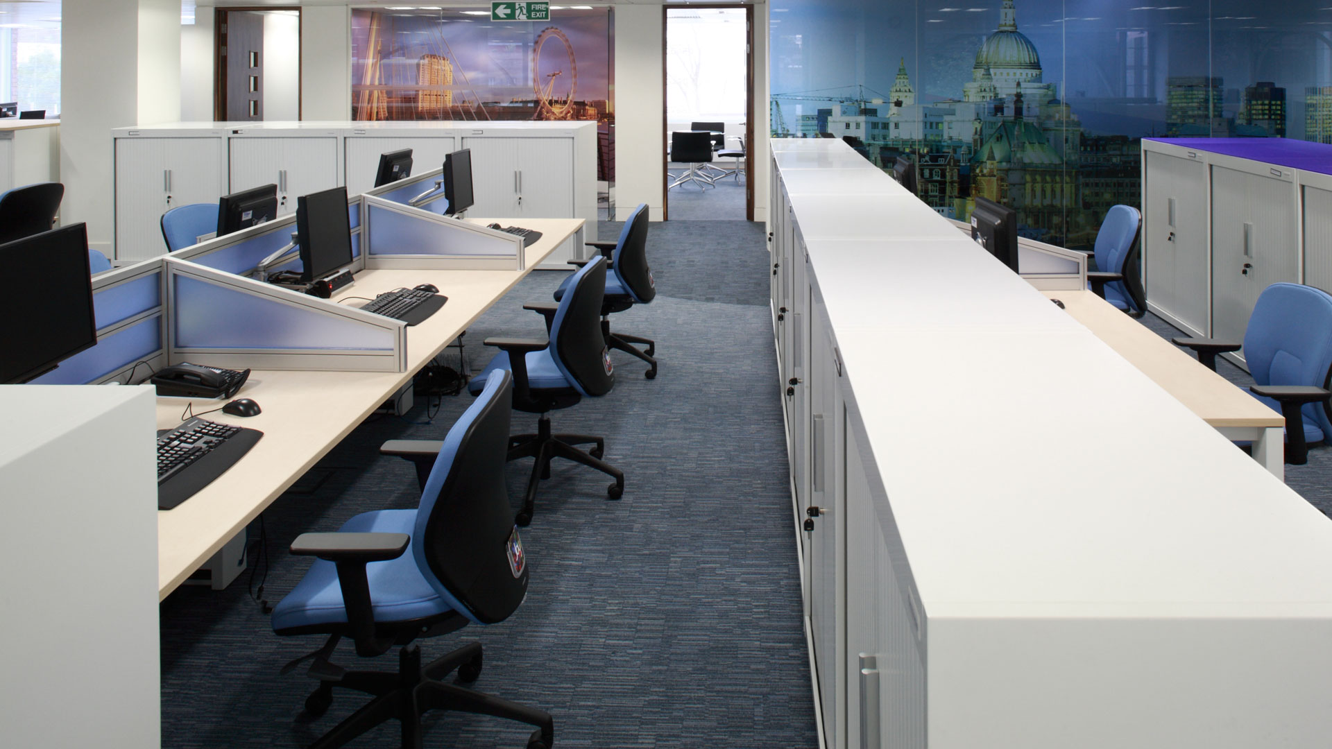 The Flexiform Jot desk range (subsequently replaced by Pico desks) was selected for its modern, bold and substantial design, which works well throughout the desking and storage. Jot is available with side filer drawers and flippers. Due to changes in gambling laws, the Gambling Commission has continually expanded to include more workstations and storage over many years.