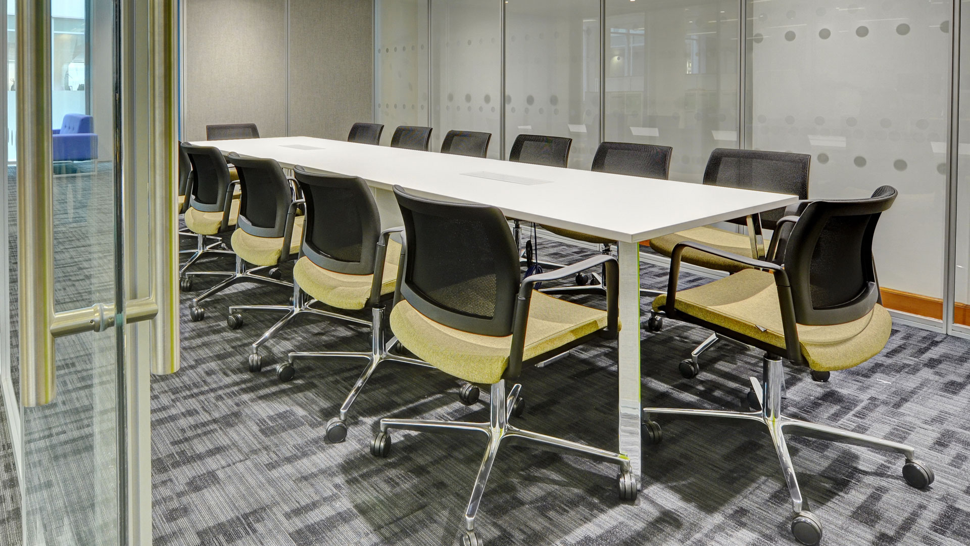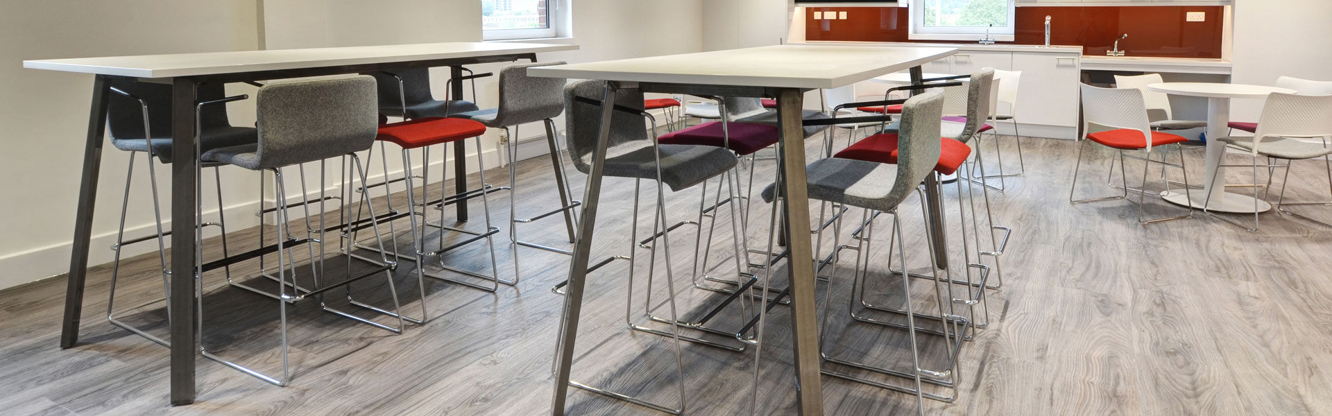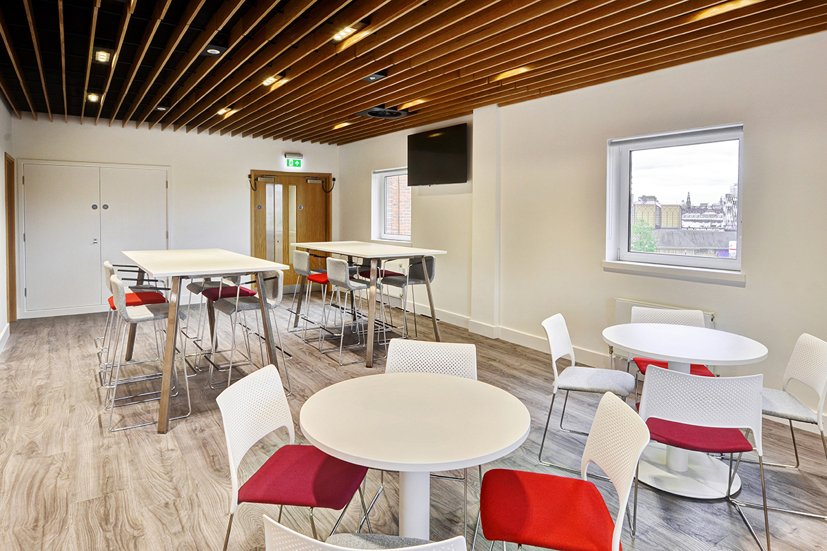 The large dining area consists of our Wilson Ply table with power and data and full cable management, our poseur height Additions 2 table and Additions Pedestal Tables. These are surrounded by a collection of stools and chairs, providing different seating options. The meeting rooms house our Additions 2 meeting tables with built-in power and data and cable management. Surrounding these are a range of ergonomic Workday meeting chairs ensuring comfort.
