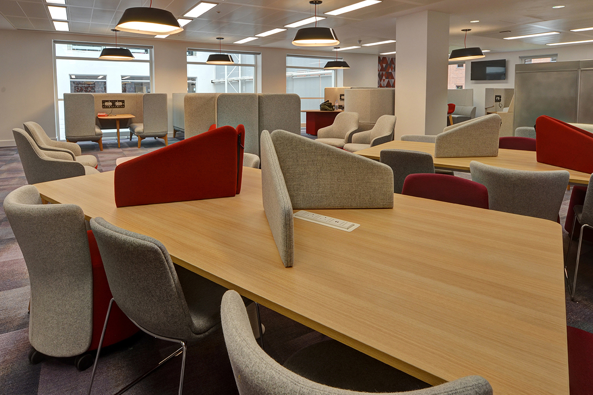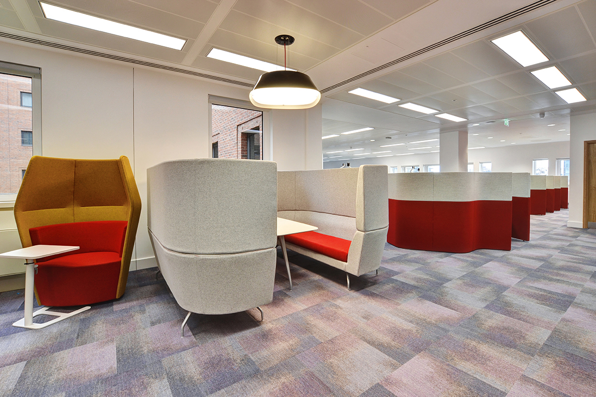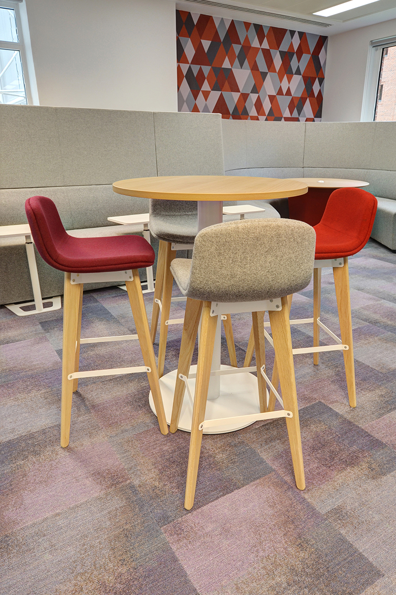 For a multi-functional workspace, our Wilson tables were installed with a range of stools and Fyn fabric desk screens on top, providing employees with a place to work away from their workstations. The Fyn wing desk screens provide privacy, and are easily adaptable and movable to suit staff needs, removing them completely for project work. The collaborative workspaces were also installed with a range of Away from the Desk (AftD) modular sofas, these sofa’s feature high backs to create a semi-private meeting space, and are installed with tables, power and data modules or teamed up with laptop tables. The AftD range is ideal for collaborative meetings, team meetings, private working, 1-2-1’s or simply to sit back and relax.