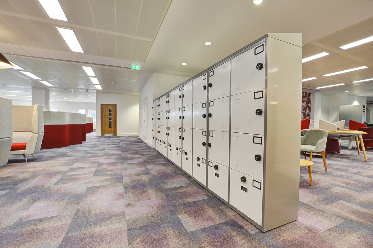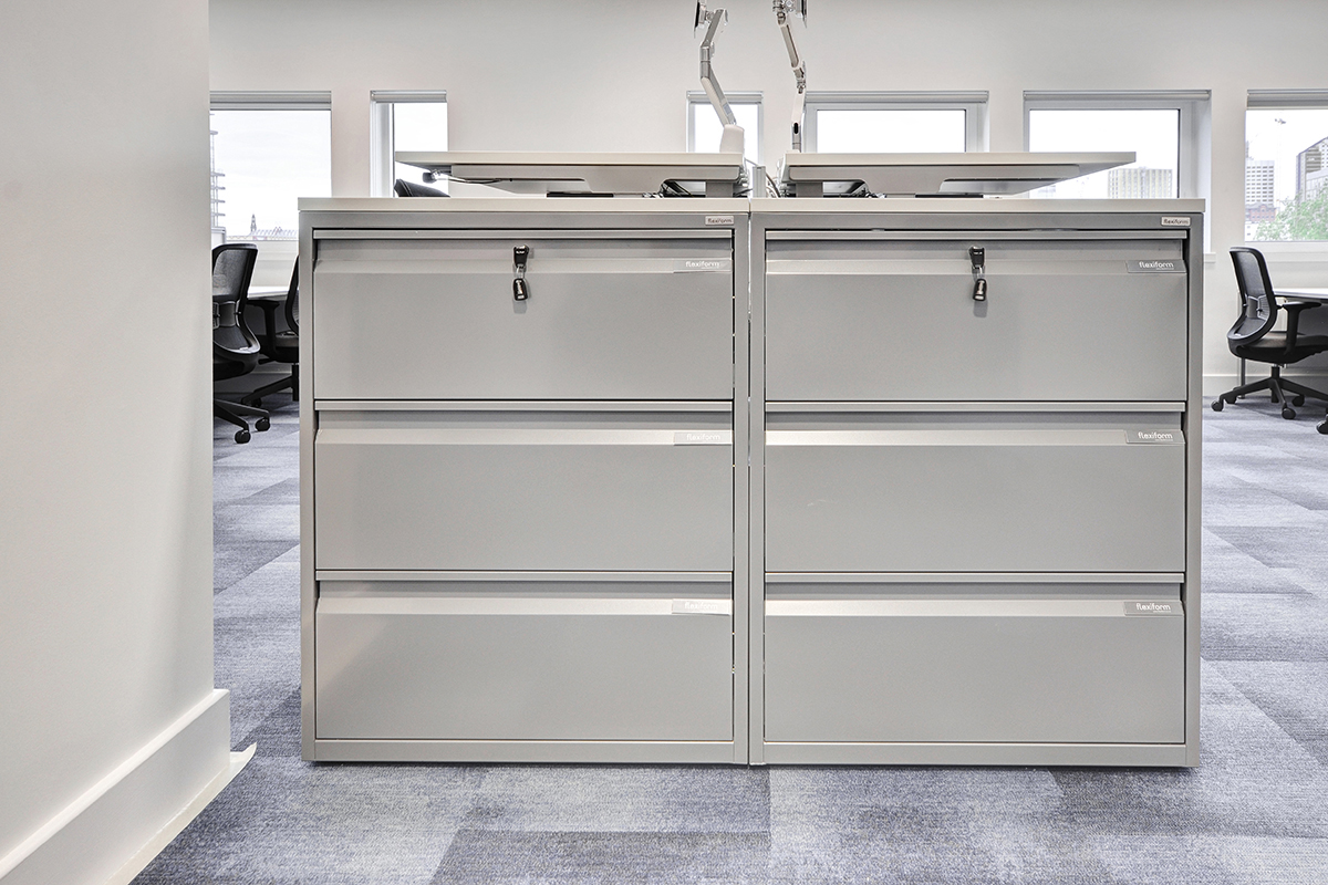 Our Jot-Up Sit/Stand Desks were placed alongside our Pico Desking range, encouraging employees to move around. Our height-adjustable desks connect to an app, allowing employees to choose how long they would like to stand for, what height it should be adjusted to and how many calories they’d like to burn a day. The Pico back-to-back office bench desks also feature crank height adjustable kits to adjust the worksurface up to 860mm (120mm), this ensures more staff get the opportunity to adjust their workspace, improving comfort and employee wellbeing. Both Jot-Up and Pico desks were installed with monitor arms, power and data modules, and full cable management. Our 3 drawer Freestor Side Filers are at the end of each bank of desks, providing a storage solution for each department.