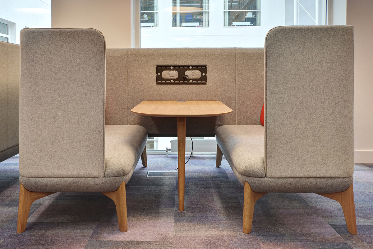 Throughout the open-plan office lies an array of soft seating, dedicated to informal meetings, 1-2-1’s, team meetings and breakout. The semi-private media booths in contrasting colours have high backs and built-in power and data for meetings, whilst the Encompass hexagon booths boast a ‘beehive’ style, allowing room for private working. This style of enclosed single booths with surrounding acoustic high backs reduces any distracting noises.