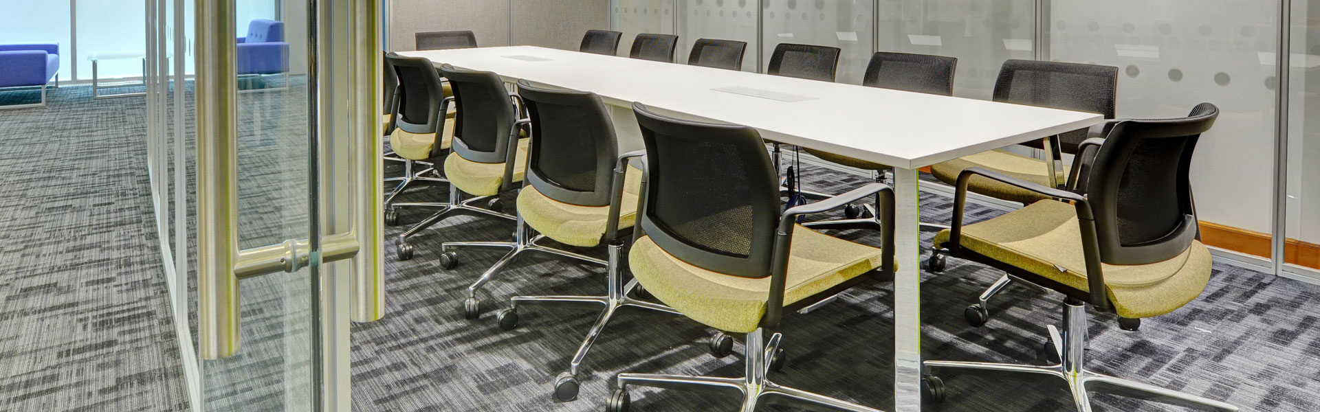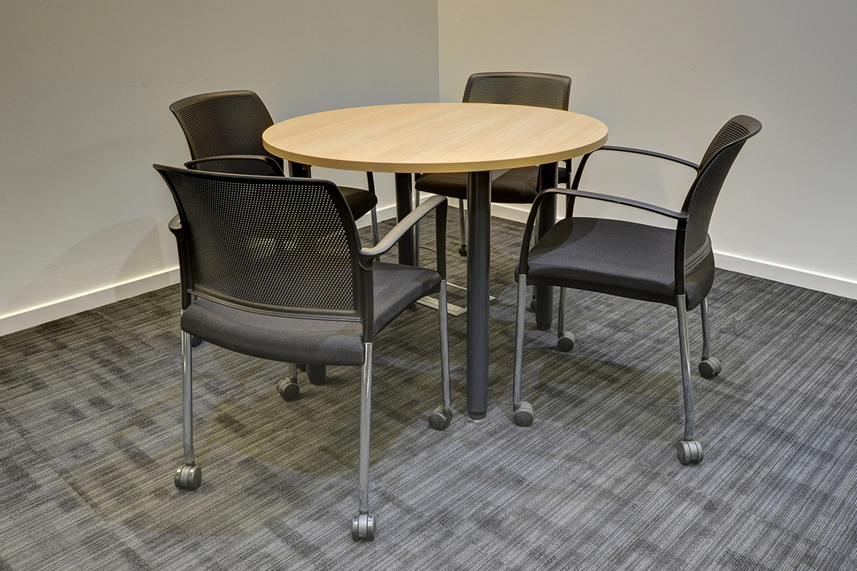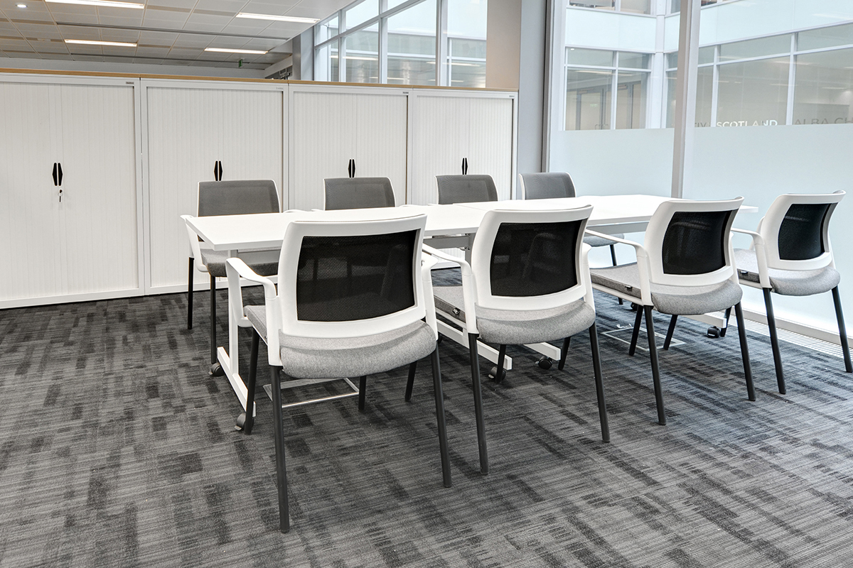 With no separate boardroom, we installed a Qube private meeting pod with a bespoke 14 person Additions 2 table with chrome legs and built-in power and data modules. Surrounding the table are swivel meeting chairs with a 5-star base and castors for easy movement. The office pod creates a room-within-a-room and can be relocated and adjusted as the needs of the organisation change.