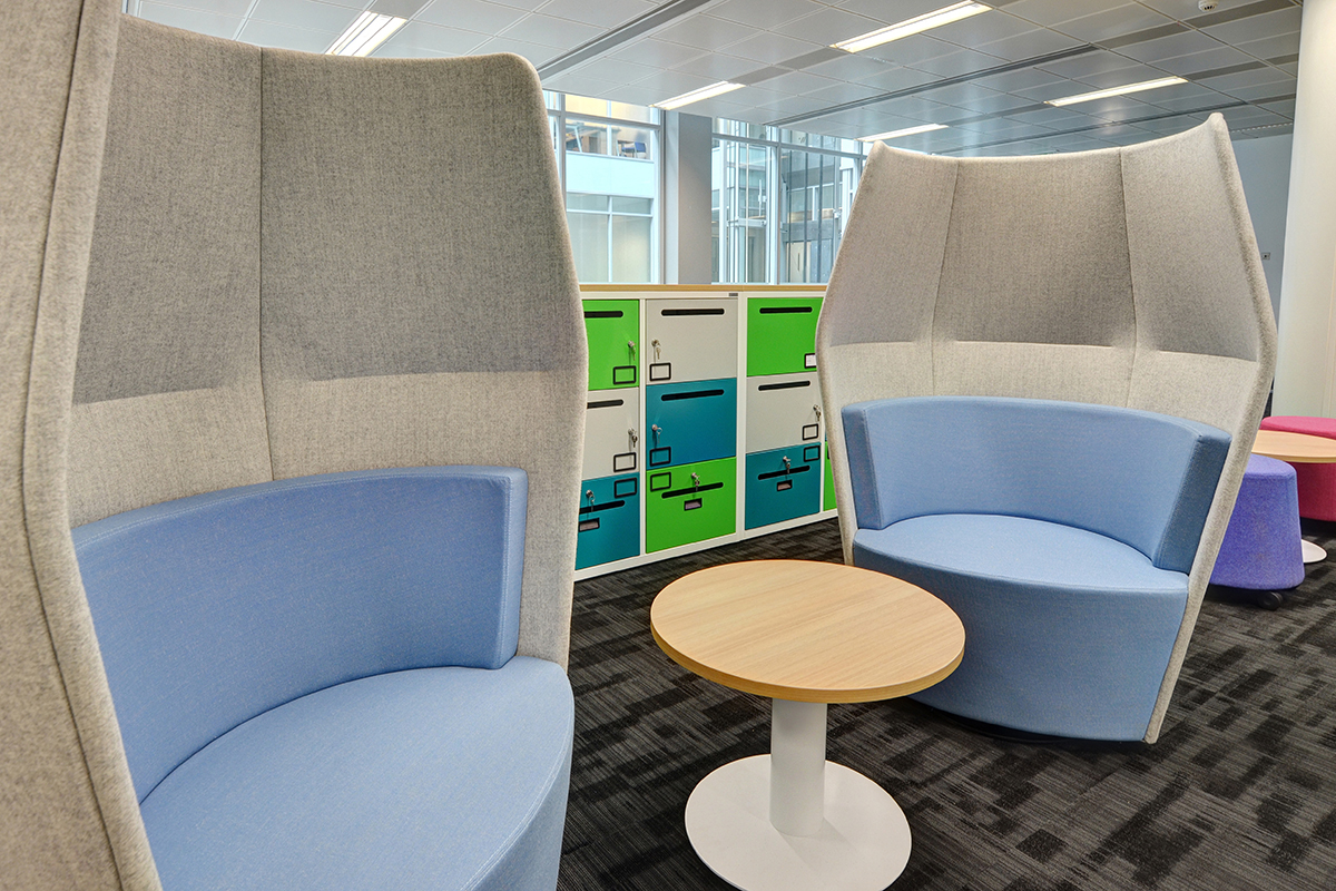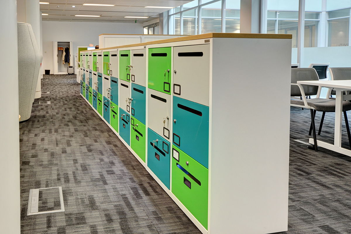 The collaborative spaces feature high-back soft seating for informal, semi-private meetings and chats and quiet working. They also offer a space to collaborate on projects. This type of workspace allows members from different teams to come together for projects and meetings, creating a community feel in the office. Separating this area from the main office space is our bespoke Freestor Accent Lockers with post slots, cam locks, label holders and bottom drawers with a bespoke colour combination. Providing lockable lockers for personal storage gives the staff a sense of owning a space, as well as security, as their belongings are safely stored in one place.