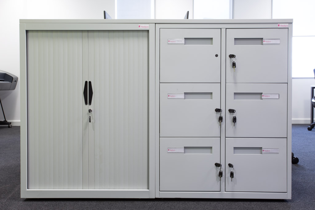 Flexiform worked with and advised the FM team to select a range of products from desks, breakout tables, soft seating and storage. Pico Desks were supplied for traditional bench desks and single desks with high capacity cable trays, CPU holders, monitor arms, ergonomic chairs and privacy screens for the full comprehensive desk setup. The multifunctionality and adaptability of Pico made it ideal for open-plan offices and managerial offices. A comprehensive range of storage was provided including bespoke lockers at the end of desks and Freestor hinged door and Freestor Tambour units. These exceptionally flexible desking and storage ranges allow large installs to tailor the furniture to staffs needs while maintaining consistency throughout the office.