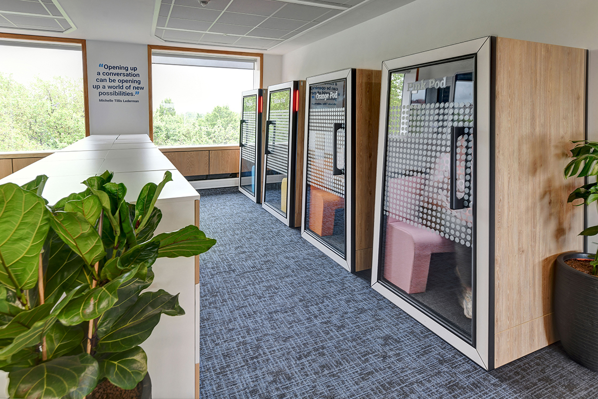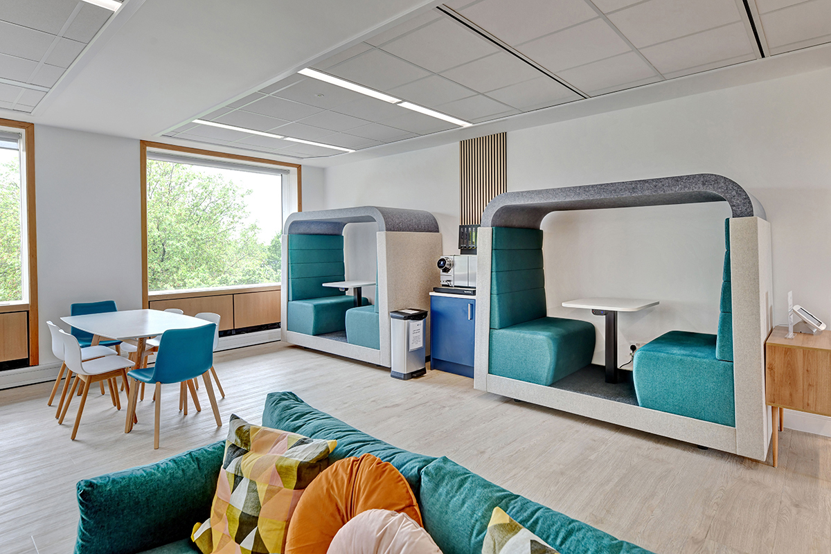 Within the office space, the Client added focus spaces to allow users to work quietly and separately from colleagues. Flexiform assisted with adapting furniture including removing unnecessary pod manifestations to help it feel less enclosed. Care and thought were also taken in the choice of fabrics, ensuring they were inclusive of different needs.
