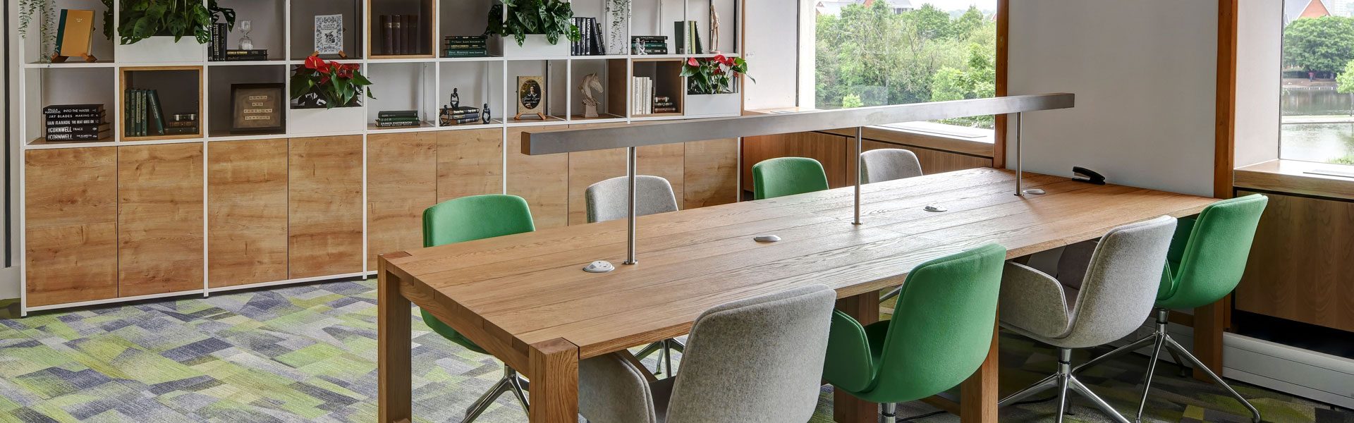 Within the boardroom, Flexiform worked with their supply partners to create a unique boardroom table. This reconfigurable boardroom table is designed to host 24 board members, whilst the table can be flipped up and moved to the side when not in use, providing a large hosting space. Combined with high-specification finishes, built-in power and cable management and an executive comfortable leather chair, the boardroom furniture creates an impact whilst being practical and functional to their needs.