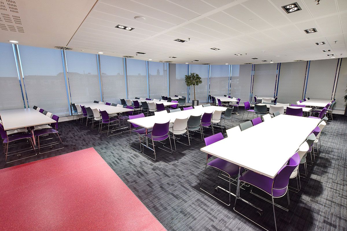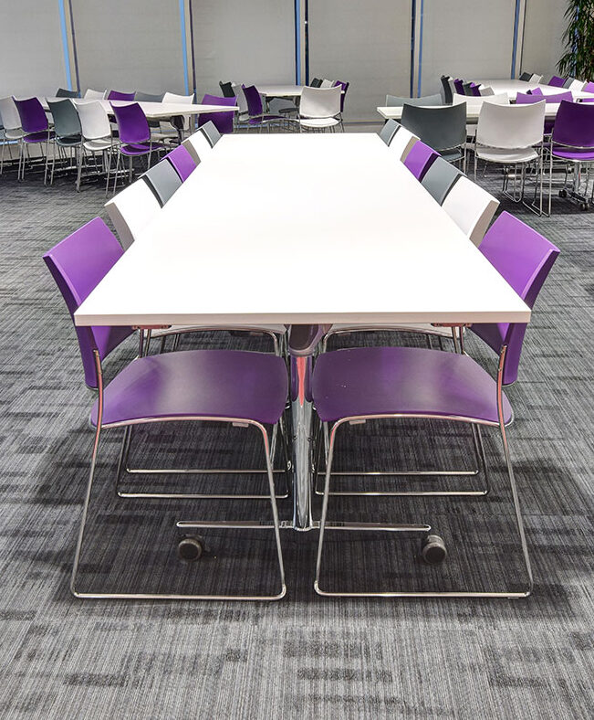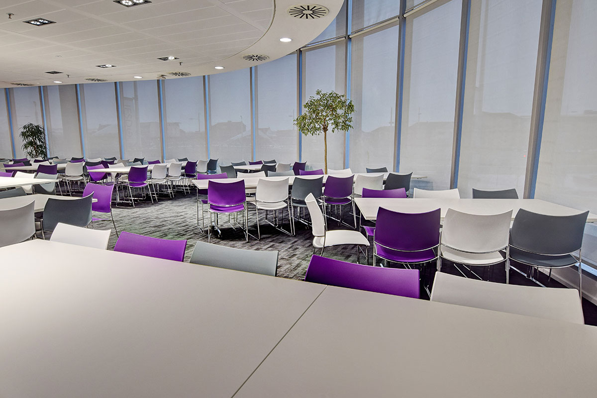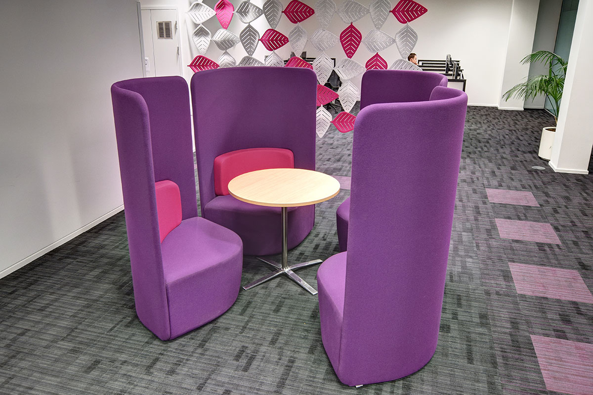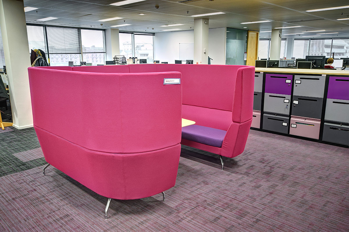 Flexiform has worked with this client for many years, rolling out a scheme to update and modernise their portfolio of buildings. This second phase saw the refurbishment of the café and collaborative office spaces, with a range of high back work booths, solo working pods, screen dividers, and freestanding screens. As part of the organisations’ ongoing commitment to agile and flexible working styles, single work pods and high back booths were specified for private working with inbuilt workspaces and task chairs. The clients original café tub chairs were reused with the addition of new high back booths for comfort, alongside a flip-top table and stacking chairs which can be reconfigured as required.