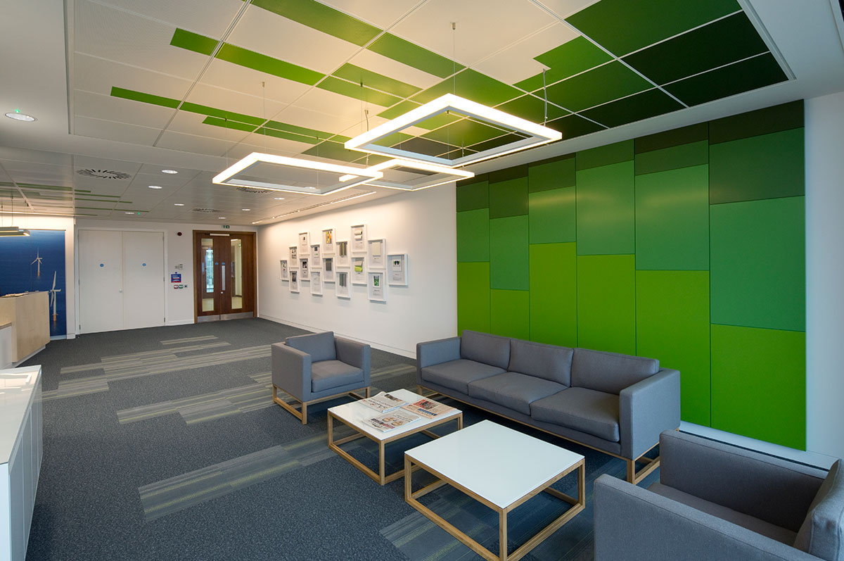 “The Judges commented that the UK Green Investment Bank and their designers have created a calm and pleasant workplace within Atria One in Edinburgh. The team maximized the inherent spectacular panoramic views over the distant Firth of Forth and in close proximity to the city skyline and Edinburgh Castle. The use of branding, colour, technology and staff engagement creates a very positive environment for the enjoyment of the occupiers, and gives GIB a pride in showcasing their operation to Ministers of State and visiting dignitaries.” – British Council for Offices