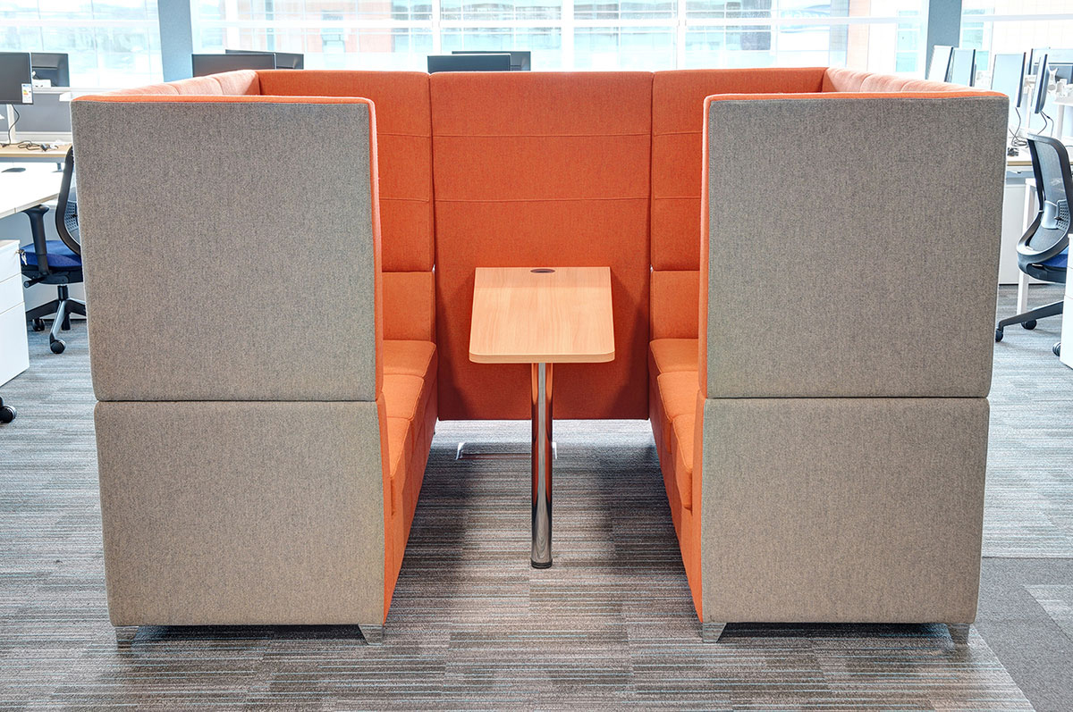 Our robust standard Pico desk was installed with fully integrated cable management, designed to maximise under desk space and hide cables. Surpassing the initial criteria, the Pico desk also offered built-in height adjustability, as well as screen partition fixtures. Freestor Storage complimented the desking and was designed to match both the height of the screens and the width of the bench desking. 2, 4 and 6 seaters enclosed sofa units break up the departments in the open-plan office, with their bold colours offering a flexible and stylish soft solution to the traditional partition meeting room.