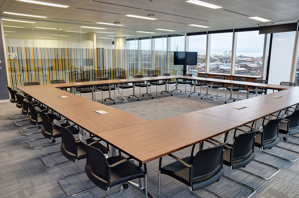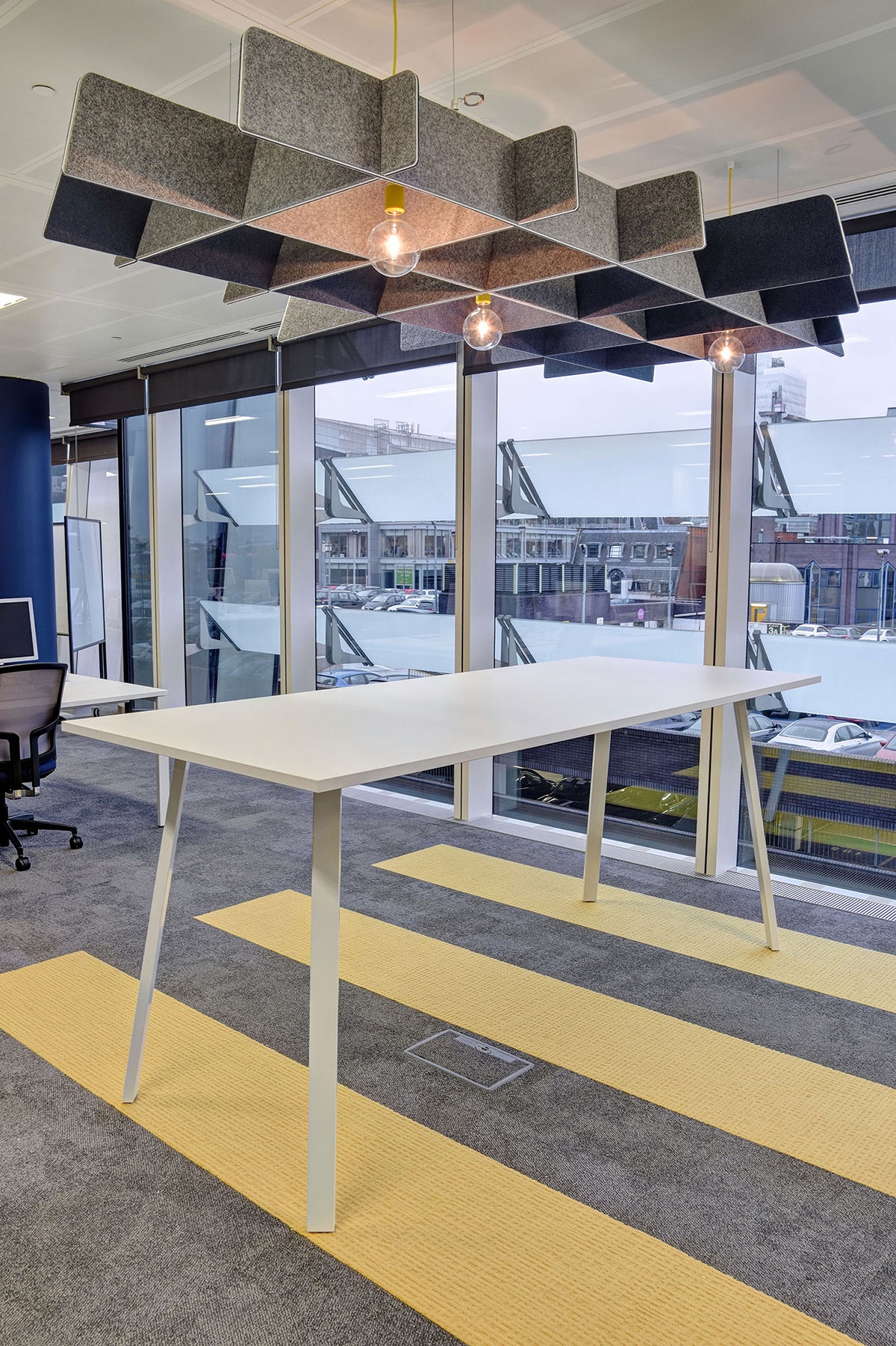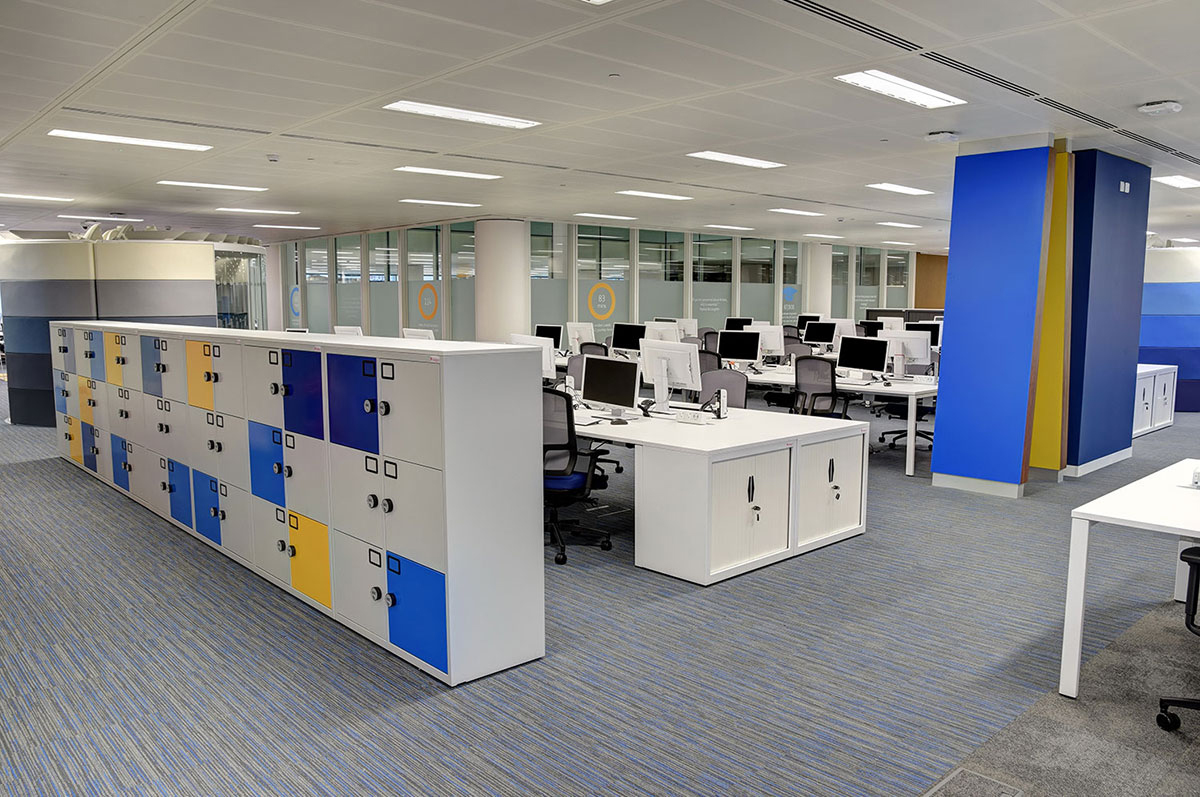 The formal meeting rooms are highly flexible, with mobile folding tables allowing these rooms to be utilised in a number of ways. The use of USB charge points on all workstations is designed to accommodate mobile technology much more effectively, providing agile, flexible working. Personal lockers remove the need for pedestals at the workstation while ensuring that all staff has a safe, private storage space. This again helps to reinforce the flexibility in the office, but also saves money on the overall scheme. The use of combination locks eliminates potential issues with key management.