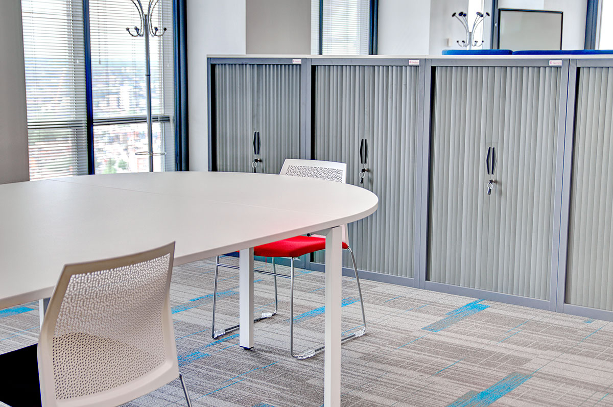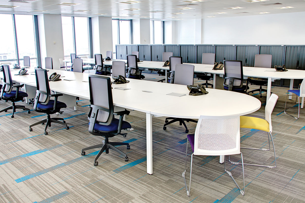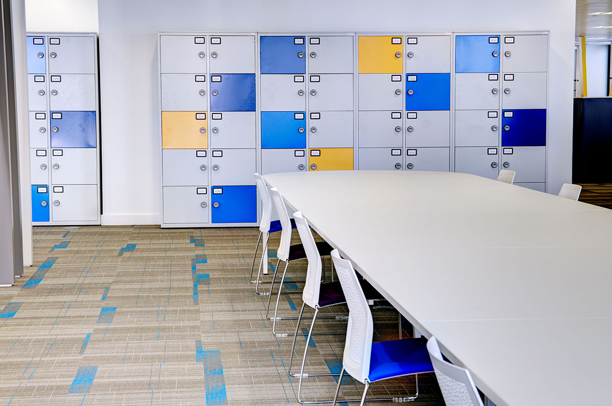 Personal lockers with combination locks remove the need for pedestals at the workstations while ensuring that all staff have safe, private storage space. This helps to reinforce the flexibility in the office but also contributes to a significant saving on the overall scheme. This project was installed over four phases, with all deliveries taking place at the weekend and installation being completed during the week.