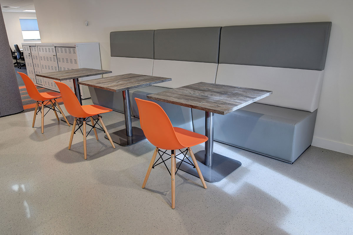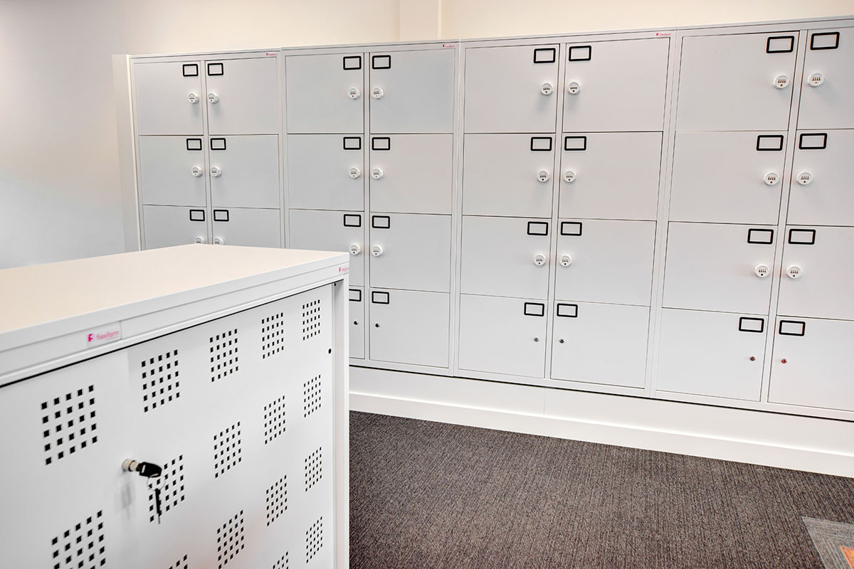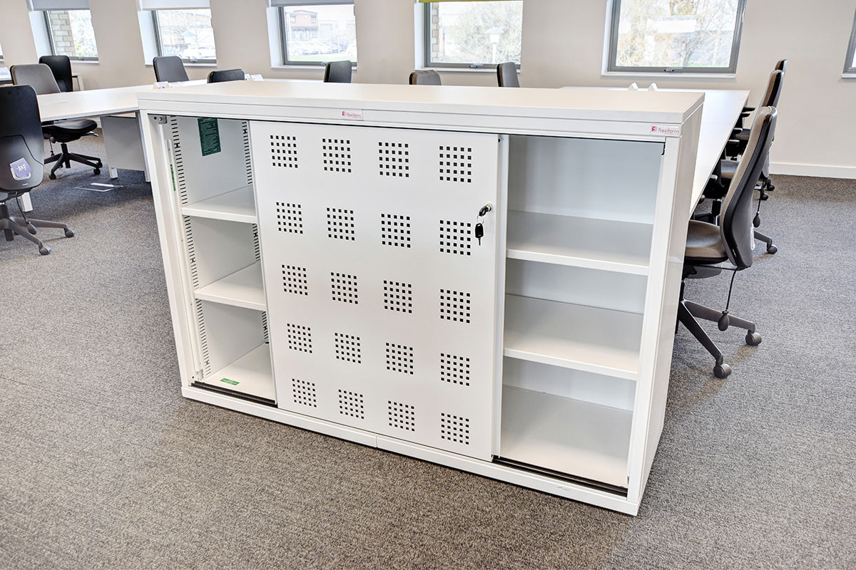 Flexiglide MK2 storage was chosen as the principal office storage product, with the sliding door offering a small operating area with high capacity storage all wrapped up in a compact footprint. The decorative perforated door of the Flexiglide has been specifically designed to absorb noise in the office, helping to improve general acoustics within the workplace. The café and breakout areas were specified in our Ferro Jackson Pine tops, with contrasting clear coat lacquer framework with further workspace featuring Additions Pedestal Base Tables and Ferro Benches.