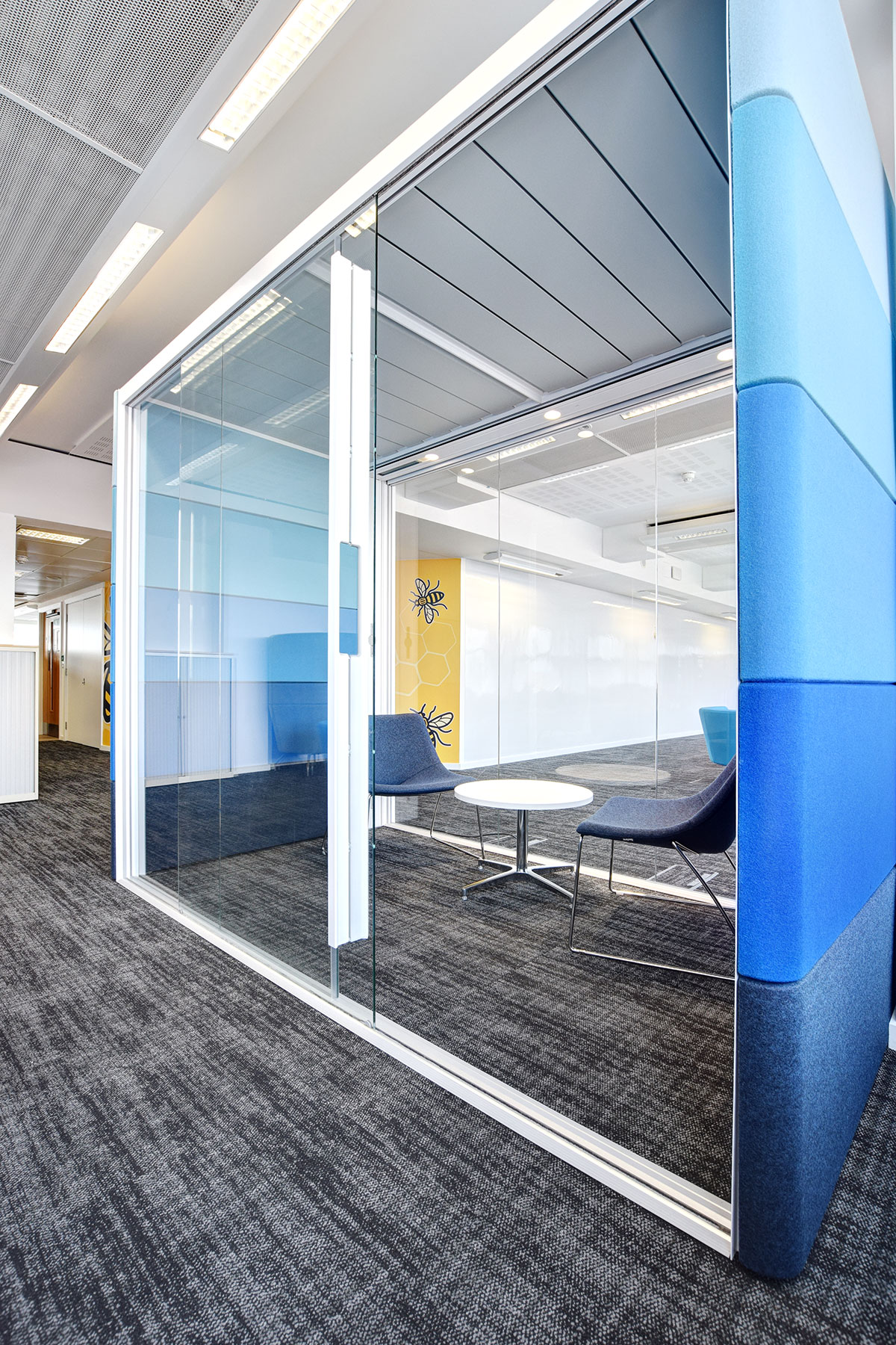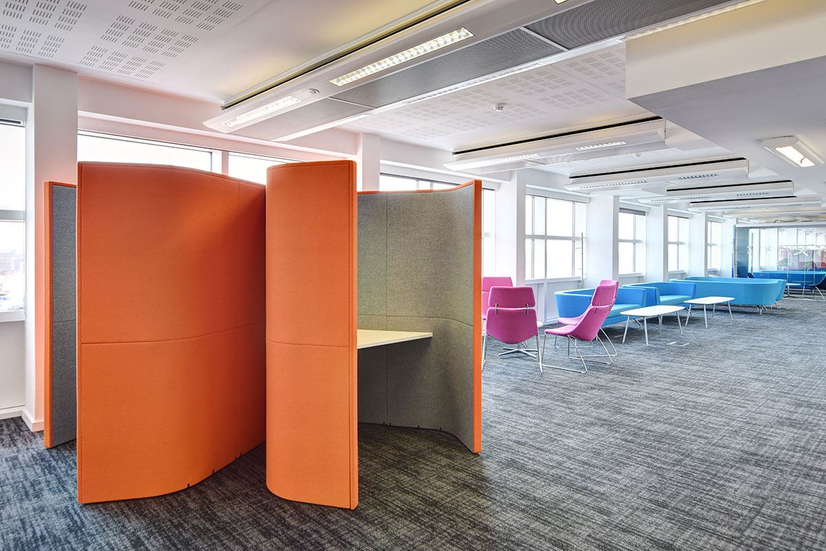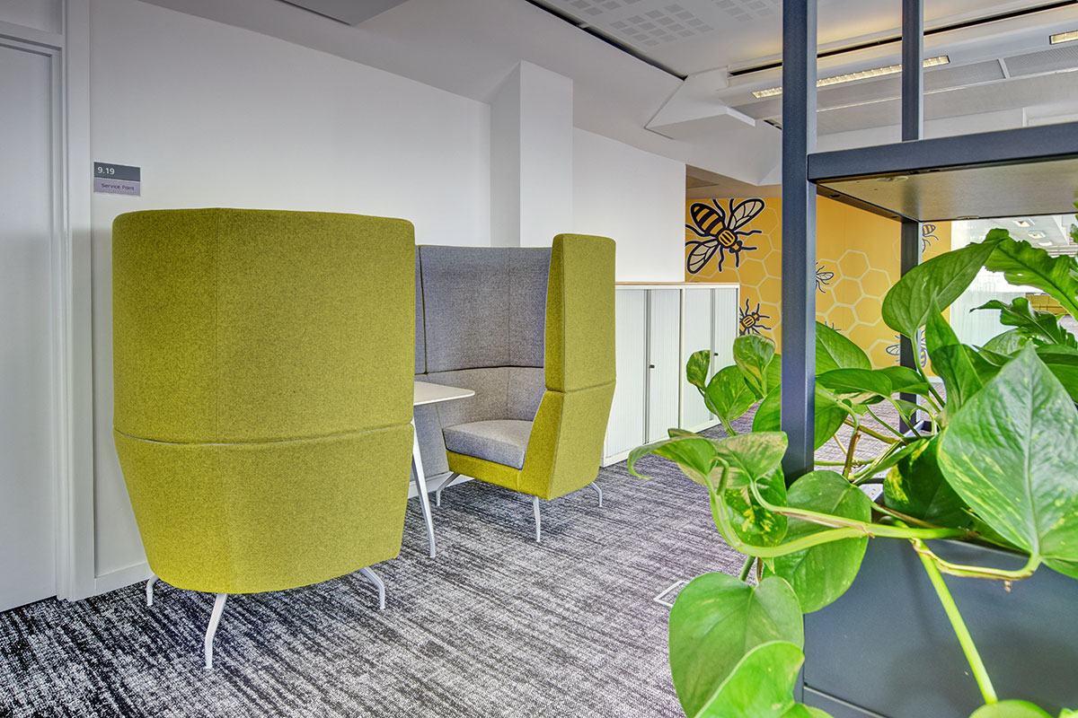 Within the Smart Working office, we also installed a range of collaborative sound-absorbing meeting booths, solo work booths and office pods, with some booths specified with TV monitors, an integral table and power and data to support laptops. These various office booths are designed to hold a wide range of meetings including quiet solo working, 1-2-1 semi-private meetings, and group discussions, collaborations and presentations for 4-6 people. All the booths and pods feature acoustic properties to mitigate noise and create a semi-private workspace.