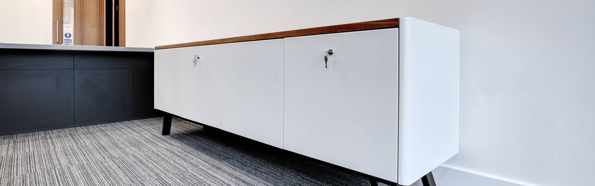 Within the new Highways England’s offices, Flexiform installed a range of reception furniture including task chairs for the reception counter, and a nearby waiting area featuring a modular sofa system and Additions low coffee tables for comfort. This was complemented by a Flexiform credenza with an inset wooden top and bespoke key locking for security, creating an elegant storage space within the reception area.