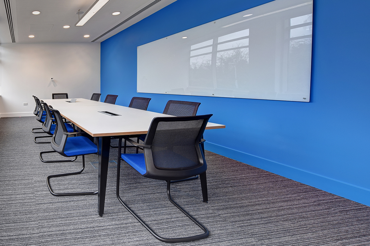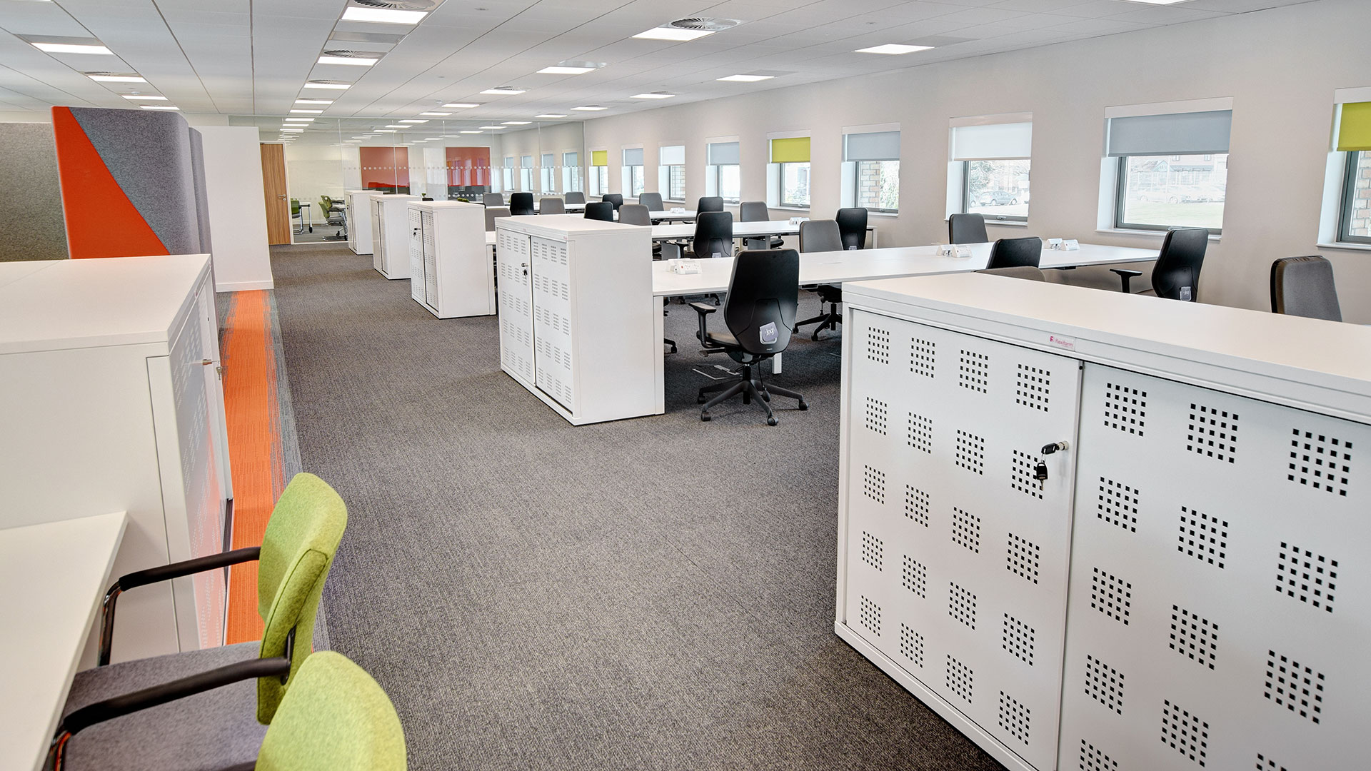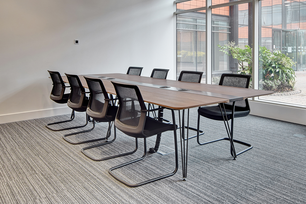Traditional formal boardroom furniture in enclosed rooms created private meeting spaces consisting of visitor chairs and an Additions 2 boardroom table with in-desk power and data modules. In addition, large Freestor tambour storage units were added for office filing, with smaller storage units dotted throughout the office for easy access. These traditional office furniture facilities are still essential to Highways England and work alongside smart working furniture.