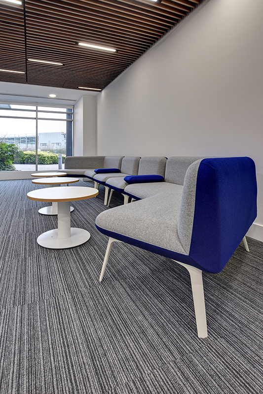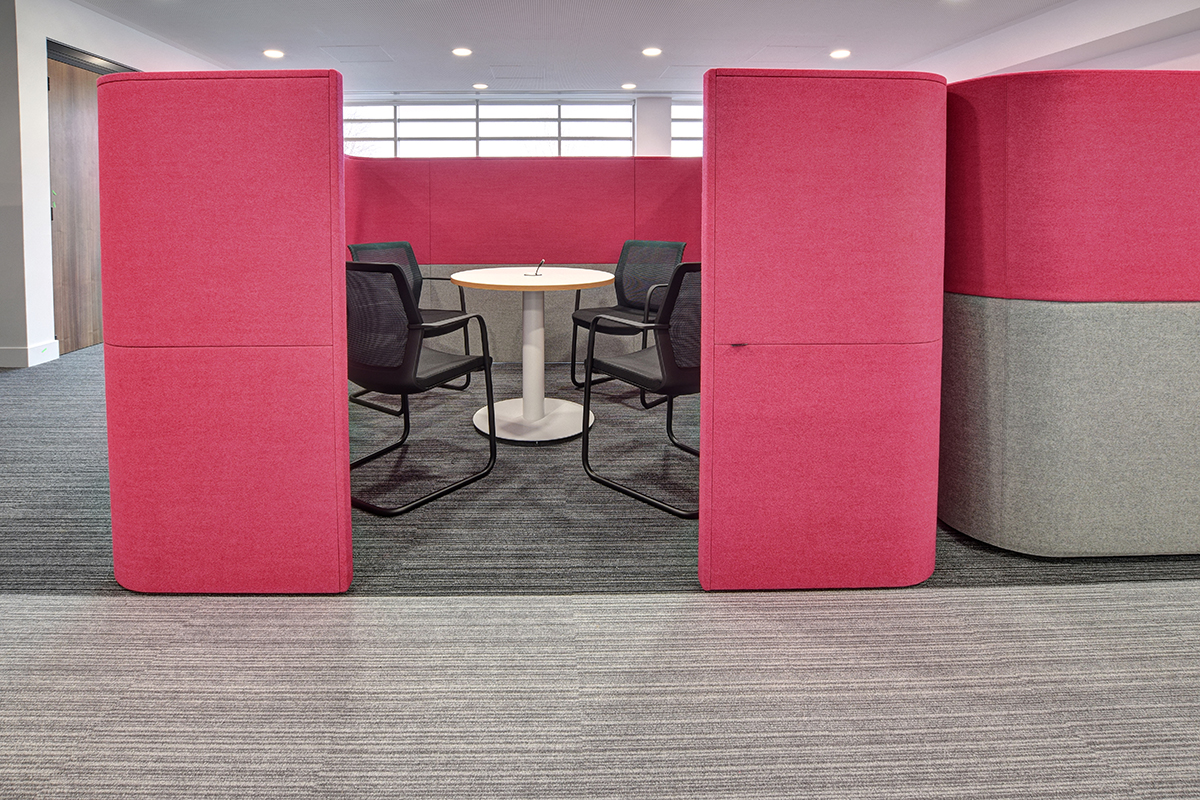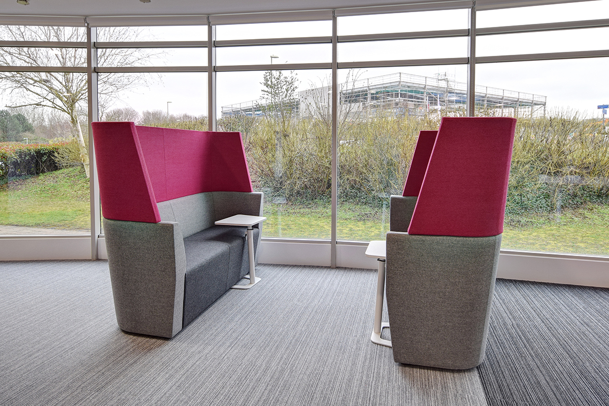 To further expand their smart working environments, a range of informal meeting spaces were installed featuring high back lounge chairs, breakout tables and single booths facing each other. In addition to large breakout modular sofa configurations with a range of high back and extra high backs to create huddle spaces. More meeting and collaboration spaces were provided with visitors chairs and meeting tables, with some semi-enclosed using Encompass booths to create a more private space with sound-deadening properties.