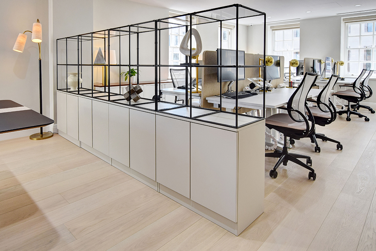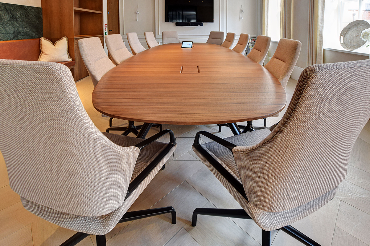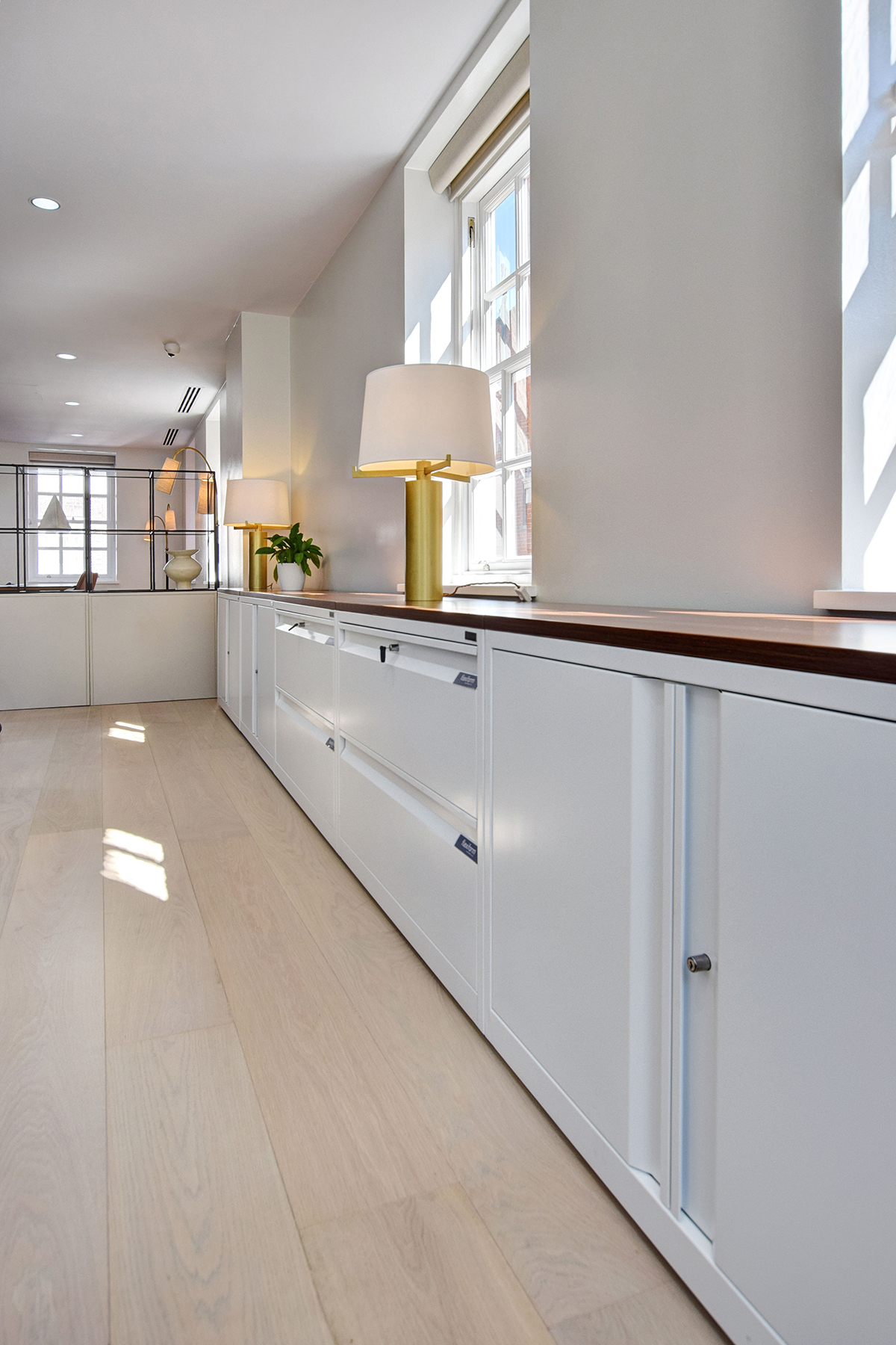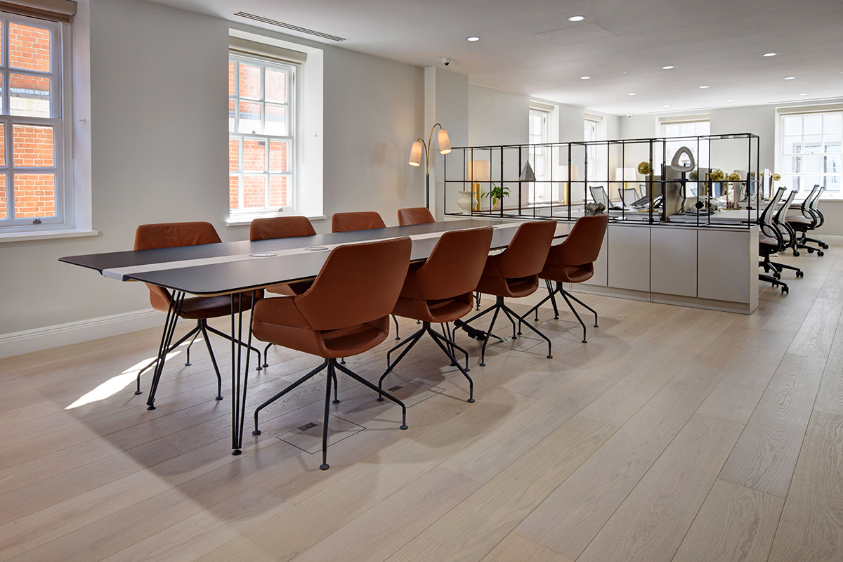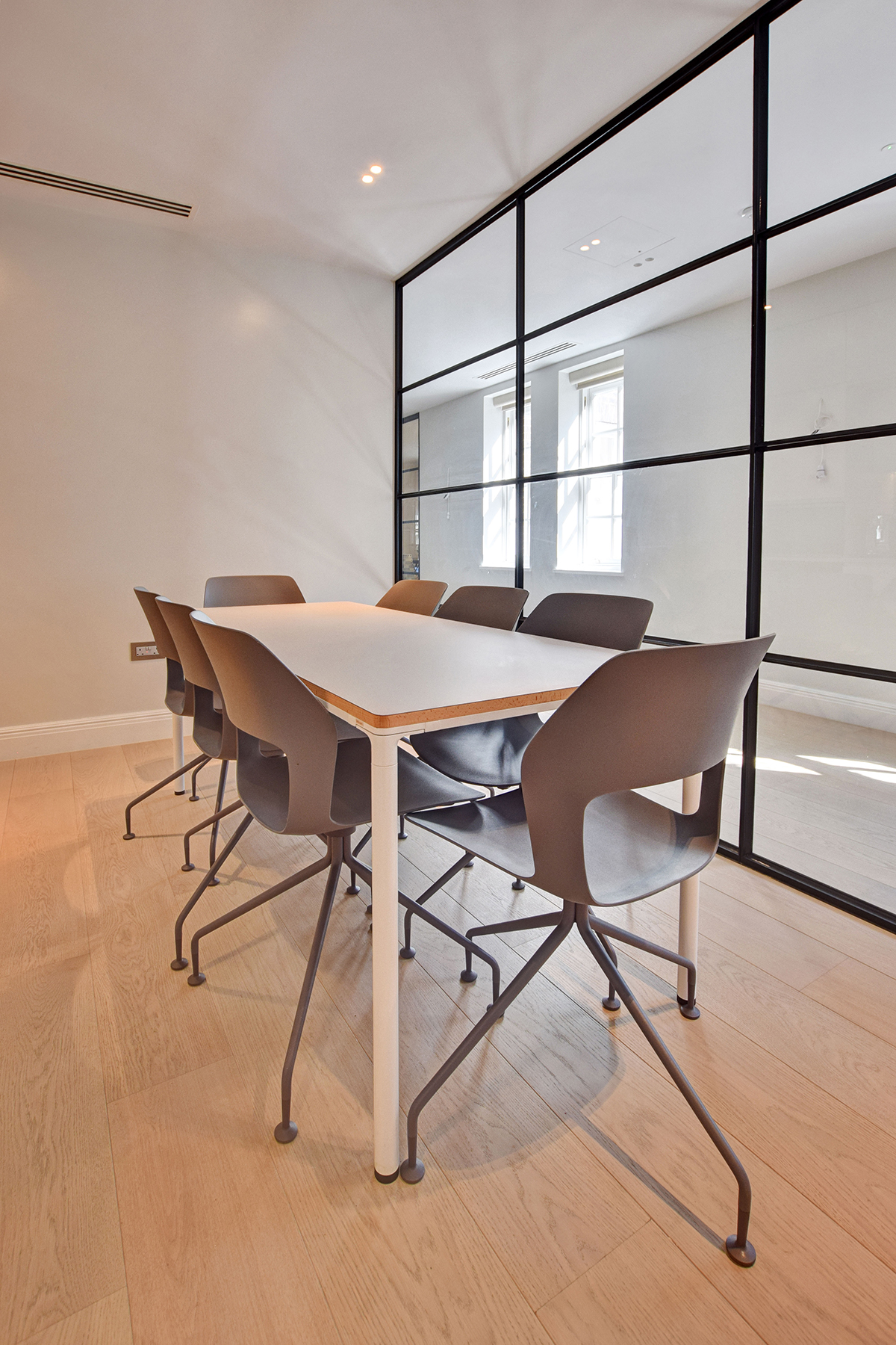 The main office space used a central grid-shelving system to divide the space, offering central storage and two distinct zones: a meeting space and the main workspace. The meeting area was fitted with our stunning Channel Work Table with hairpin legs, Fenix laminate chamfered edge top and upholstered central power and data strip, complete with leather meeting chairs for consistency.