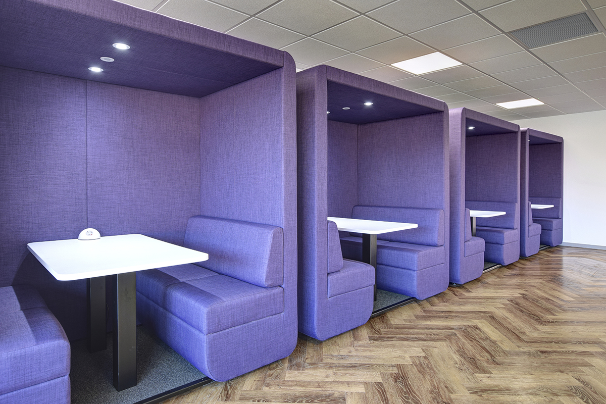 The students working area and breakout space had a variety of furniture available for them to work independently or as a team. Comfortable sofas were provided for students to share ideas and relax in groups of up to 8, whilst Additions pedestal base tables with power modules for charging laptops allowed a single student, or groups of up to 4 to collaborate on computer-based tasks. These bistro tables and stacking chairs could be easily reconfigured to accommodate larger groups as and when they are needed, offering true flexibility. To provide a semi-private space for students, Flexiform installed acoustic office booths with a full overhead roof system to absorb sound, helping students to focus on their studies. The new facility is a fantastic versatile space for students.