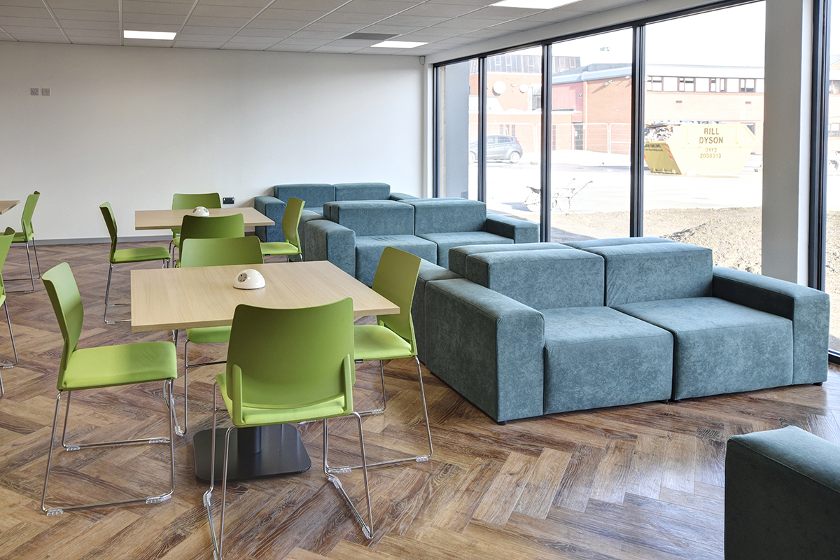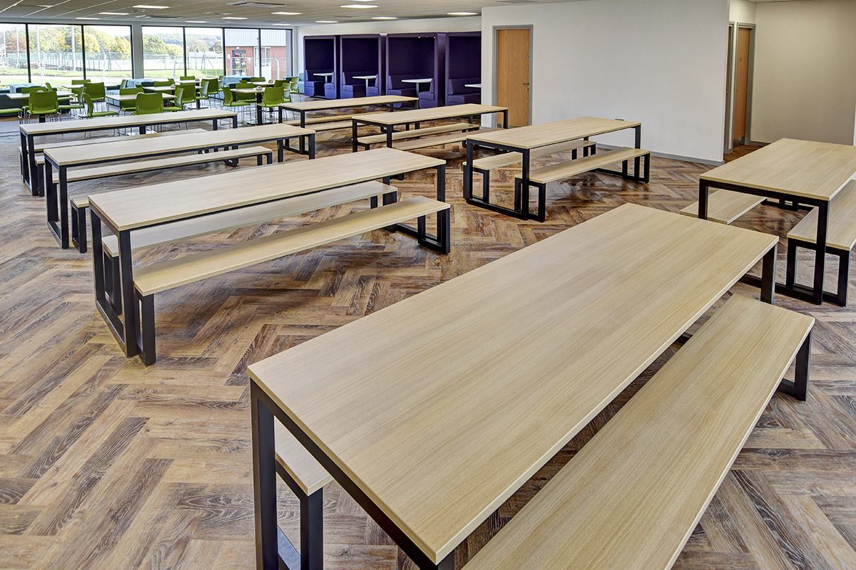 The 6th Form room was split into two zones; a canteen area for students to eat, drink and chat, and a second area designed as an informal work area. The canteen space was designed to be robust and easily cleaned with traditional Flexiform Parq canteen tables and bench seats, providing a high-capacity dining space to ensure students always had access to sit down and relax in between classes.
