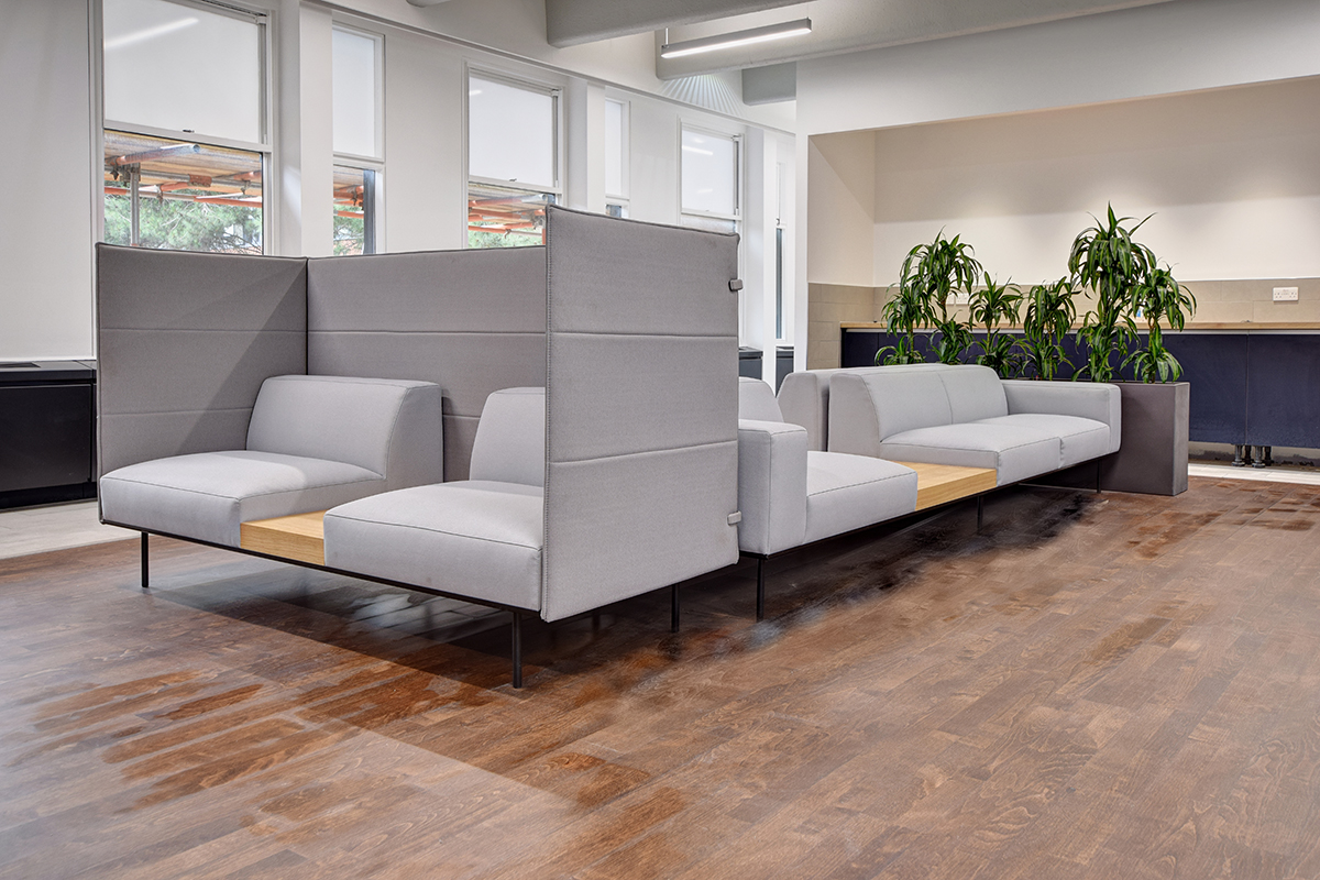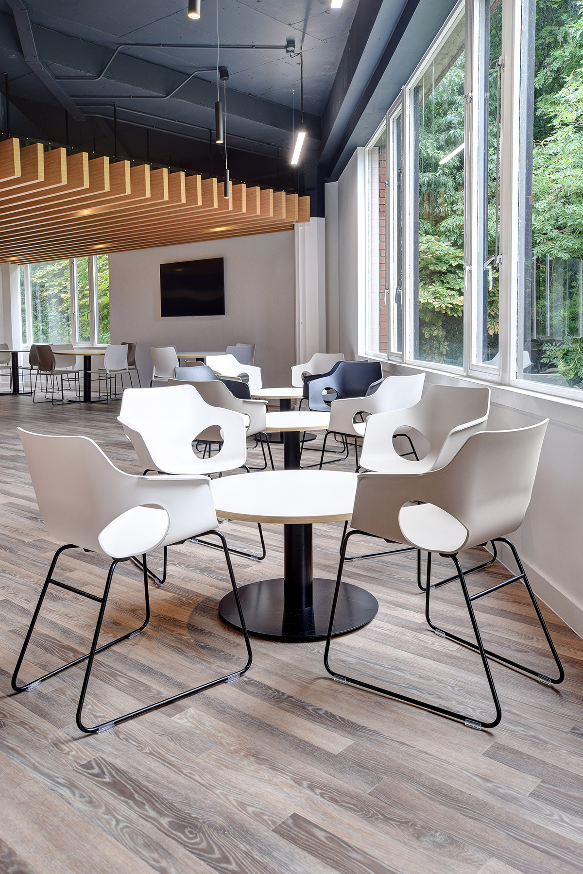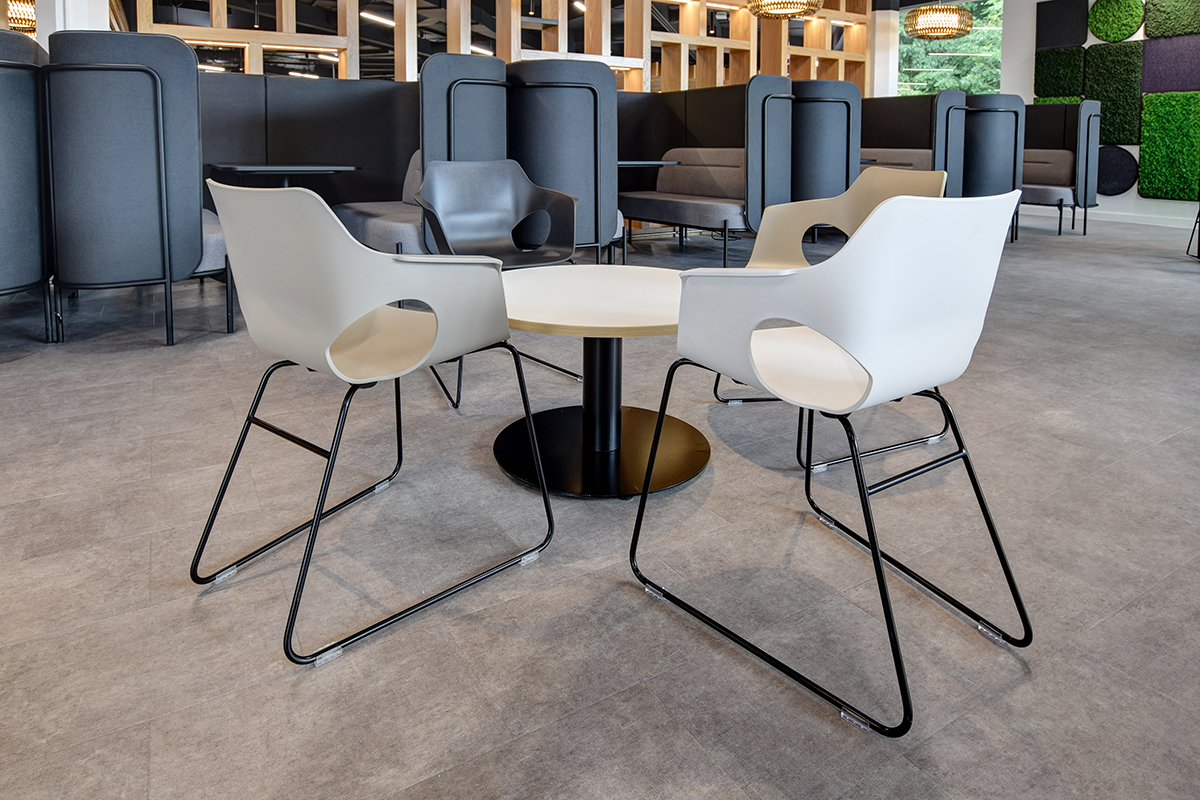 Our Parq poseur height bench table with black loop leg, white top and contrasting ply edge were selected for the canteen, paired with our Miss stools with a bespoke black skid base. To create a relaxed lounge space for catch ups and informal meetings, the Olé mono-shell chairs were selected with Additions pedestal base coffee tables. To maintain consistency throughout the space, dining areas used the Melita stacking chair in cream, white and grey to compliment Olé. Together with the sofas and media booths, the space provides a wide range of comfortable seating areas suitable for long and short stays, while being coherent in design and aesthetics.
