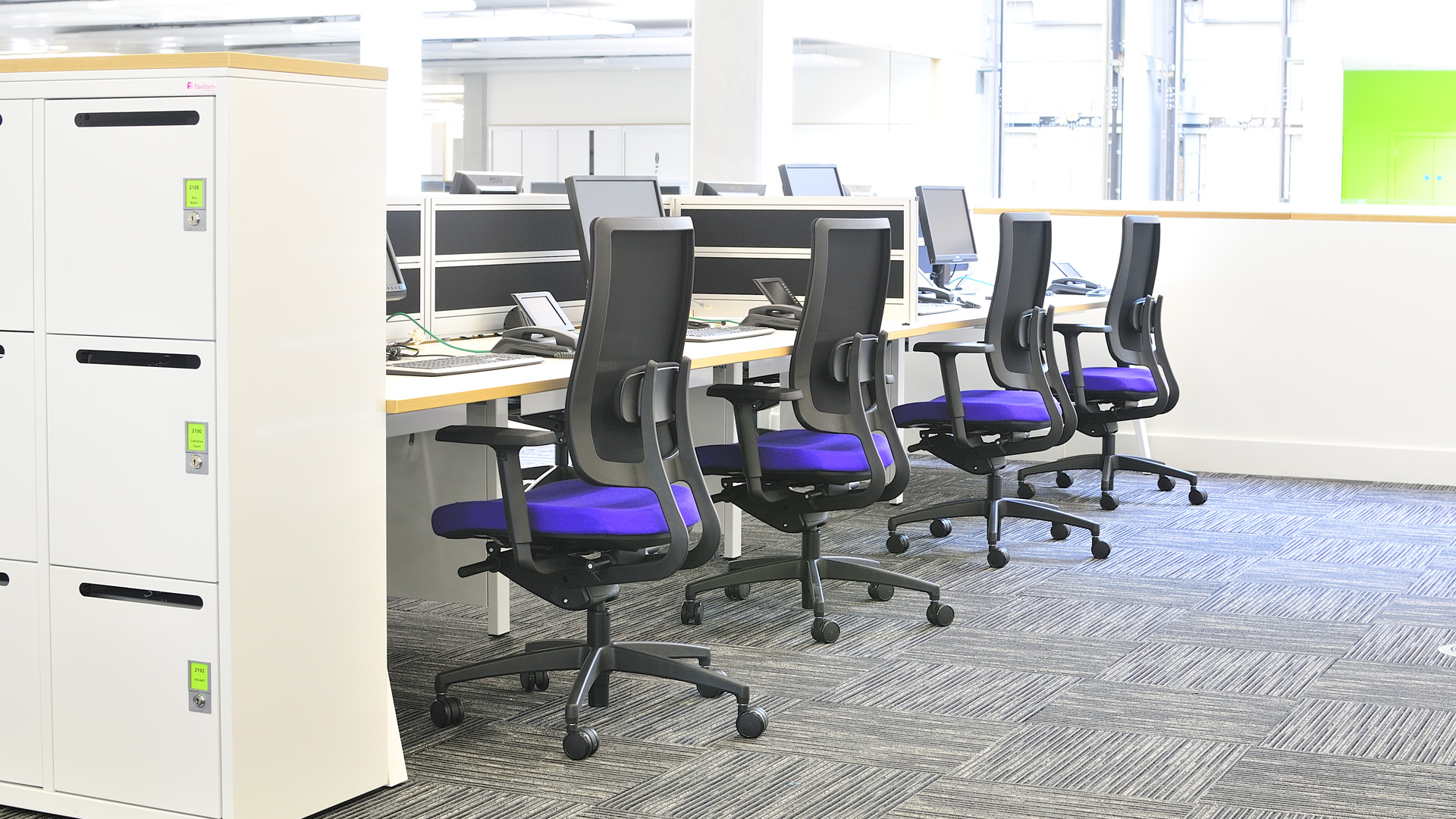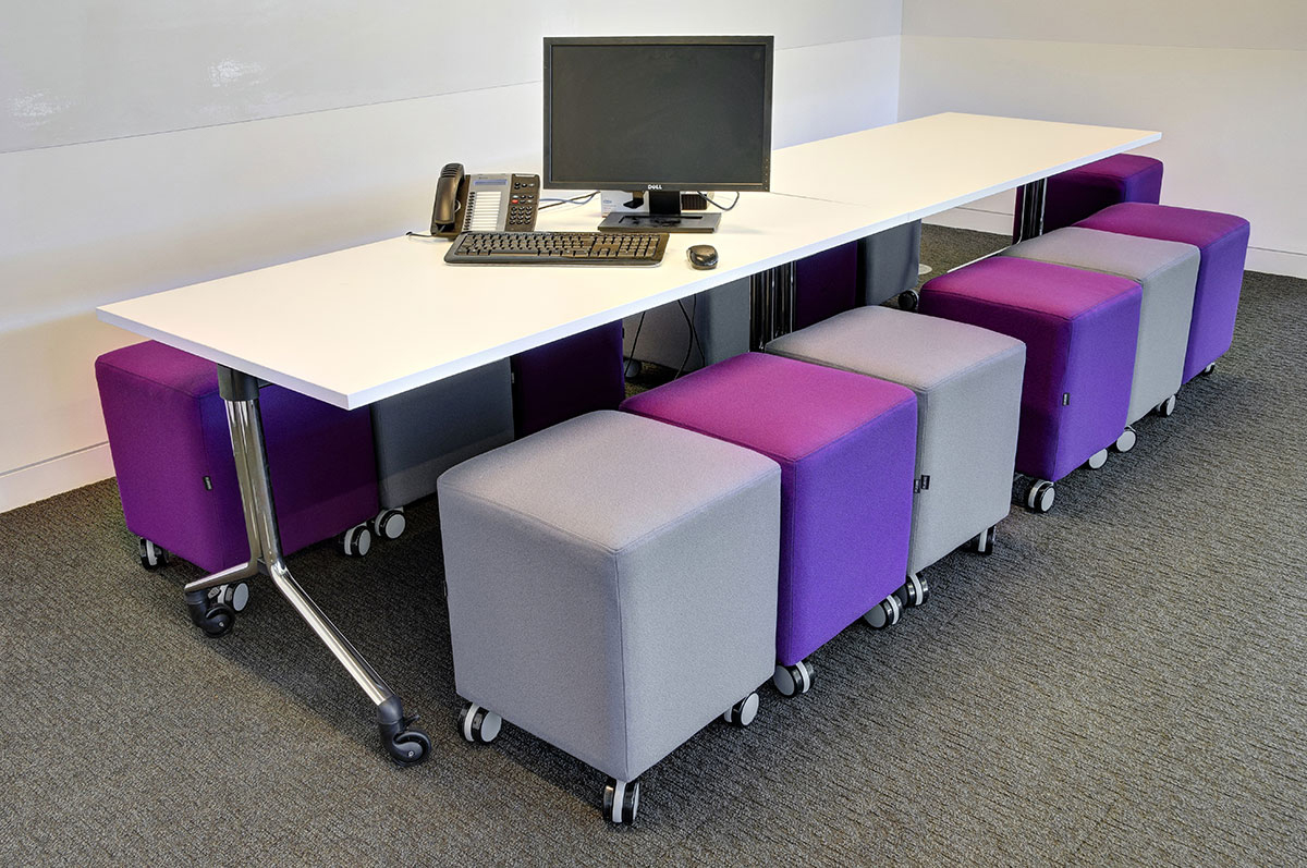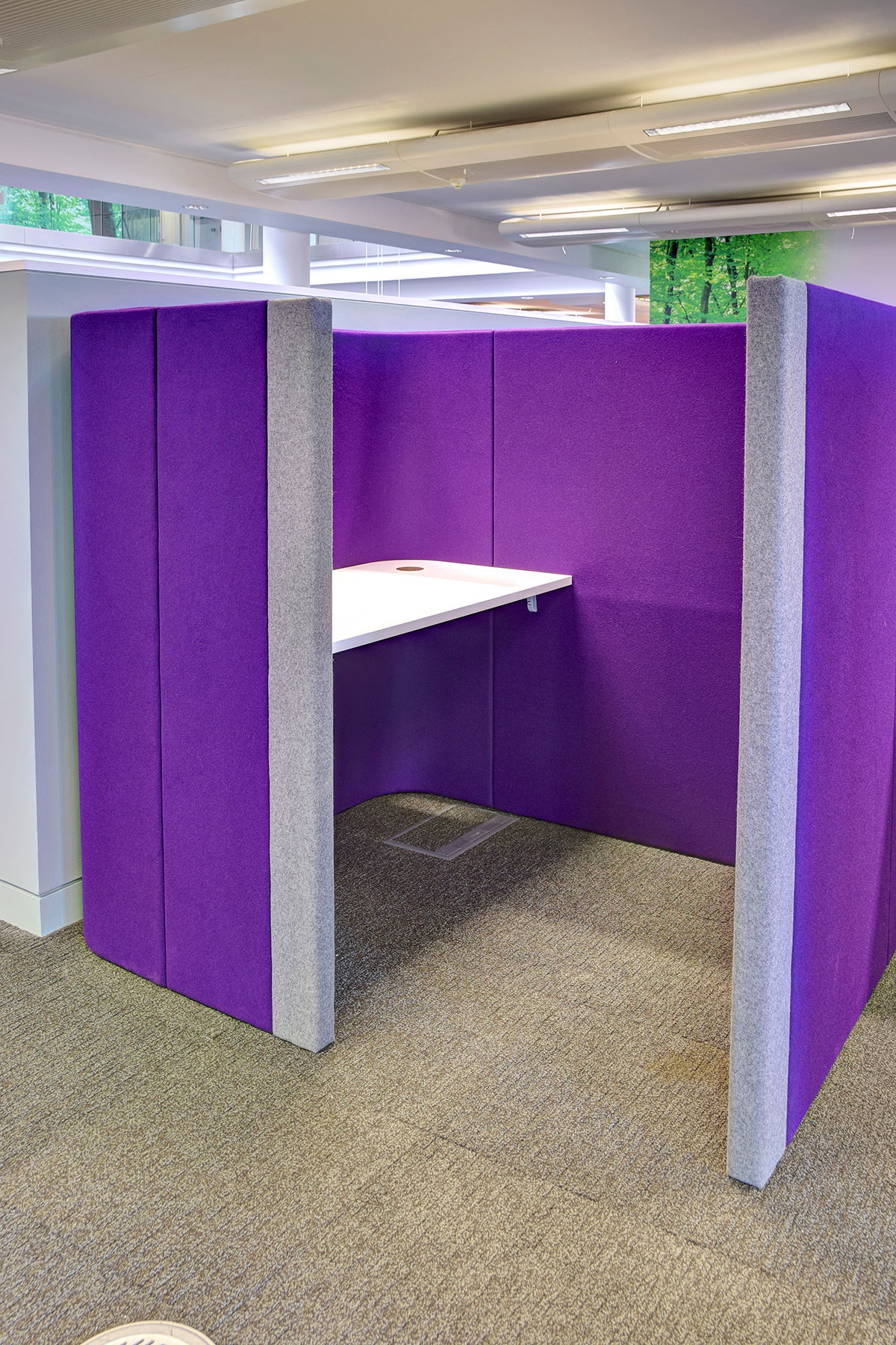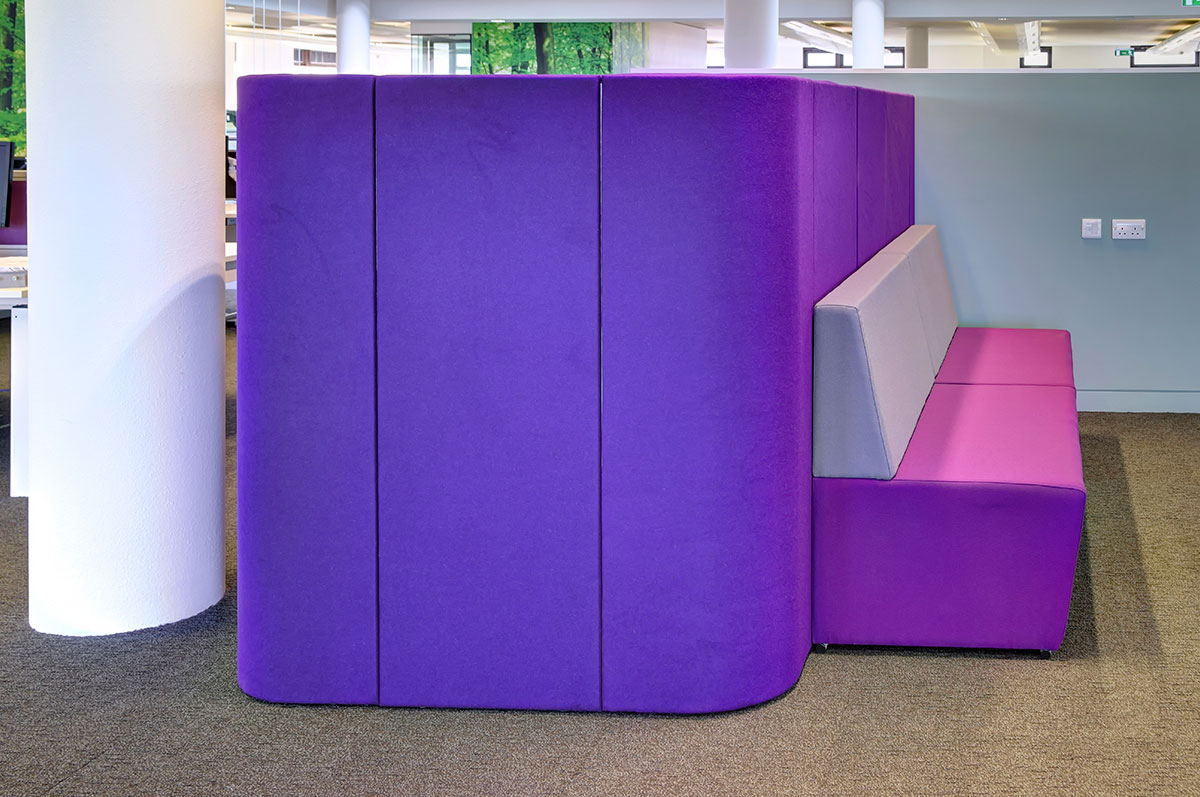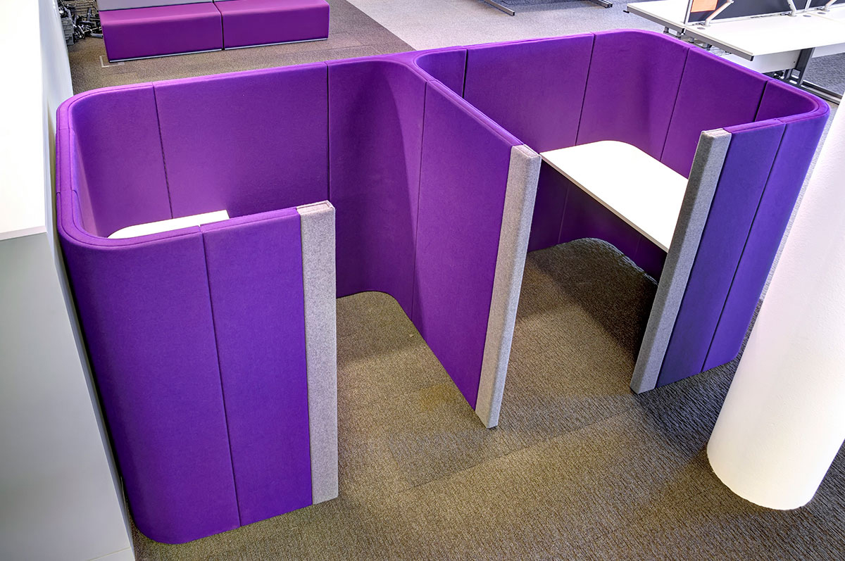 The Land Registry office features back-to-back working booths, with acoustic properties ensuring privacy for quiet individual working. Acting as a centrepiece for the workplace and serving to divide space in the office, the booths are finished in a striking grey and purple fabric, offering comfort as well as a clean, contemporary look to the workplace. Flexiform also provided a variety of seating options including flexible, contrasting grey and purple stools, as well as high-backed sofas offering space for both breakout meetings and comfortable individual working.