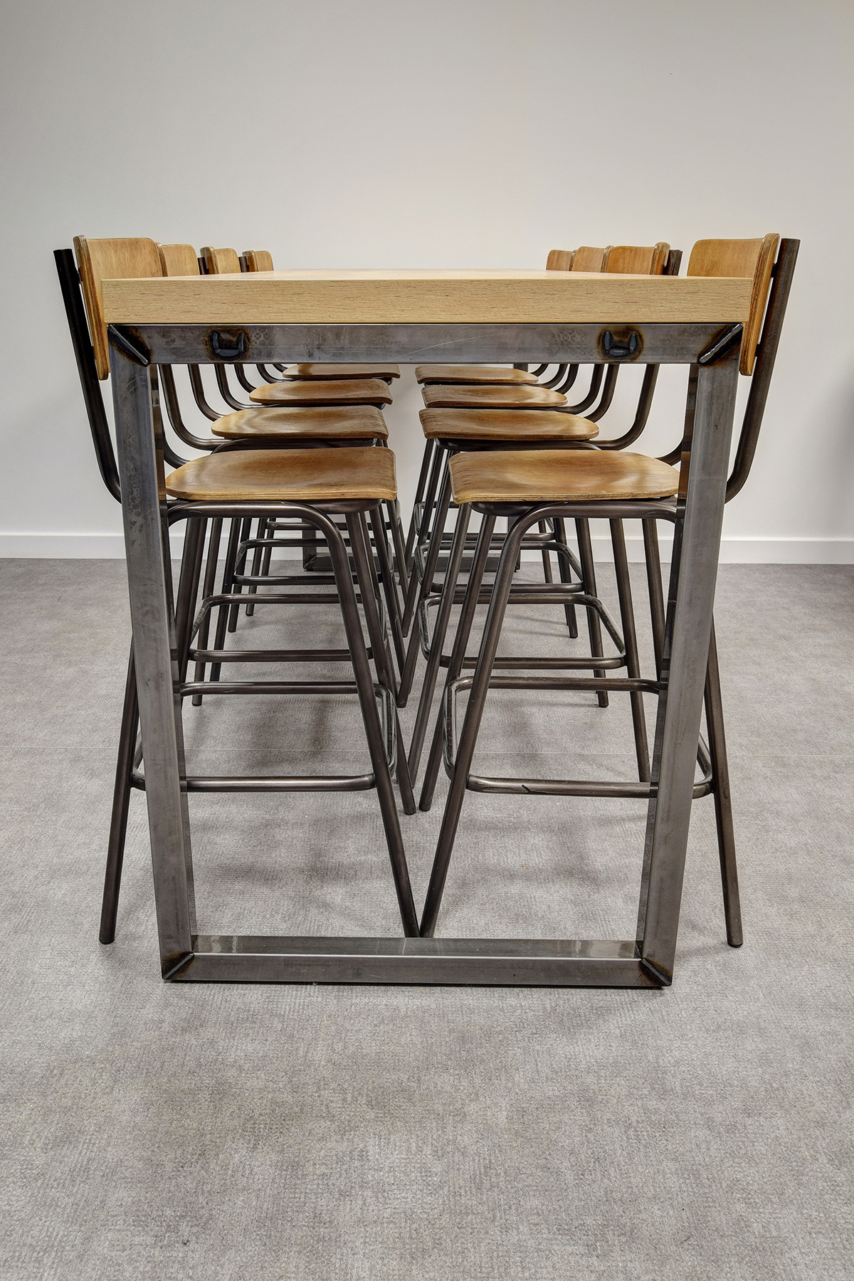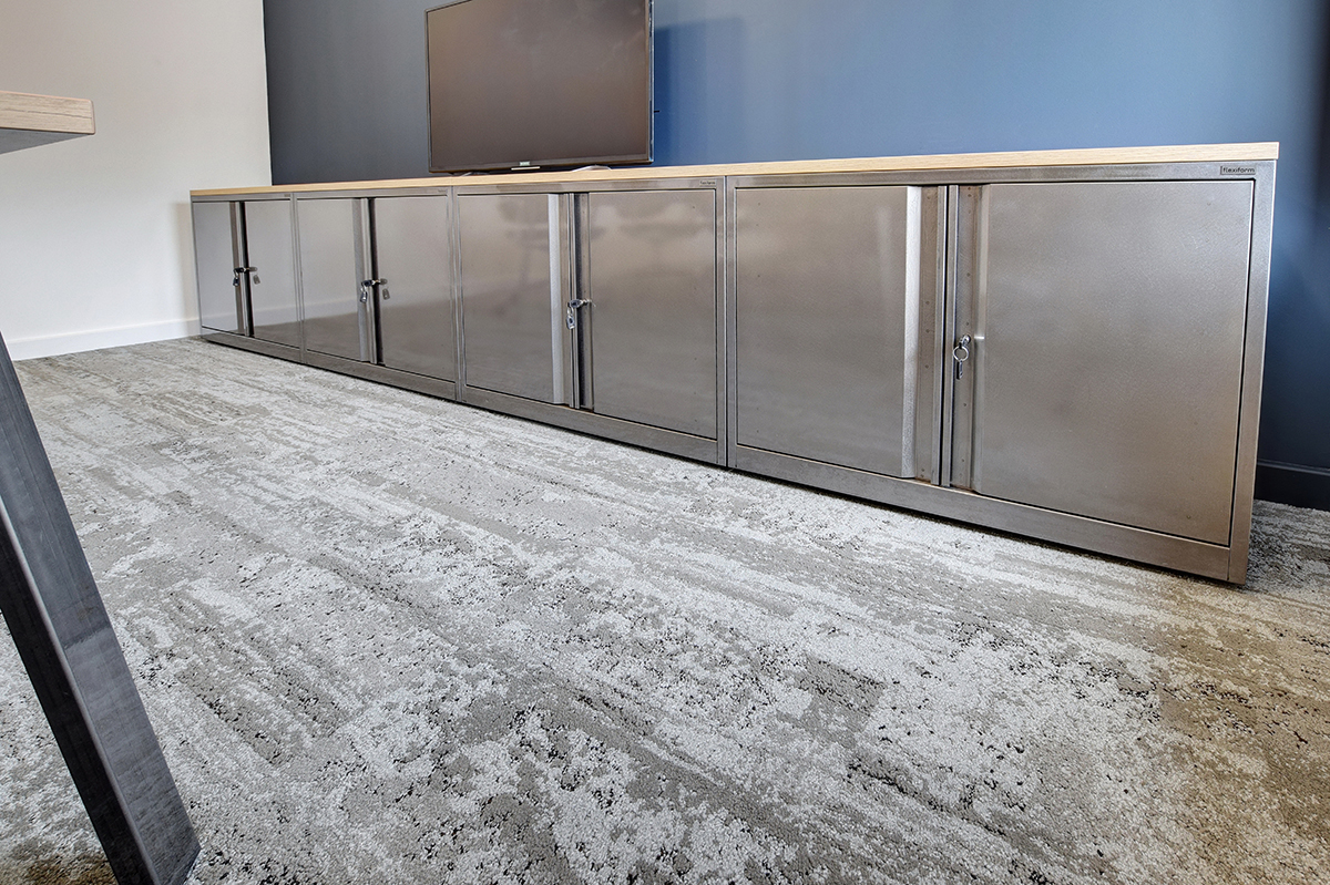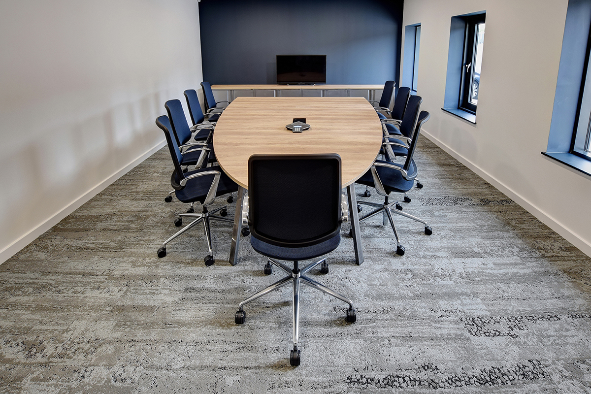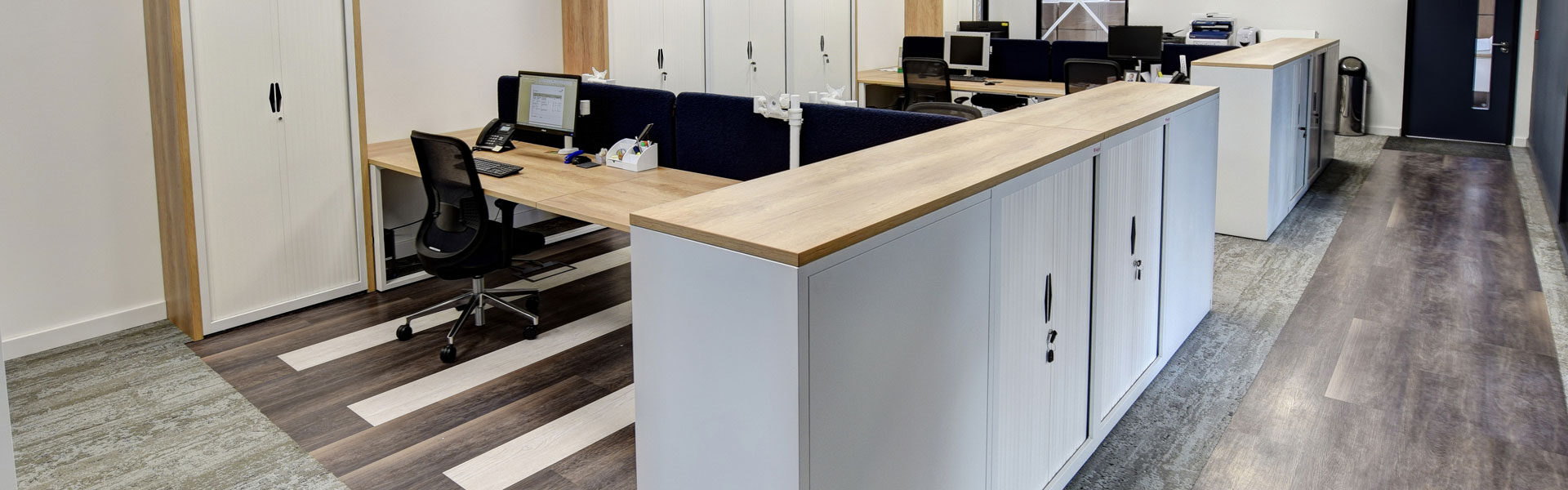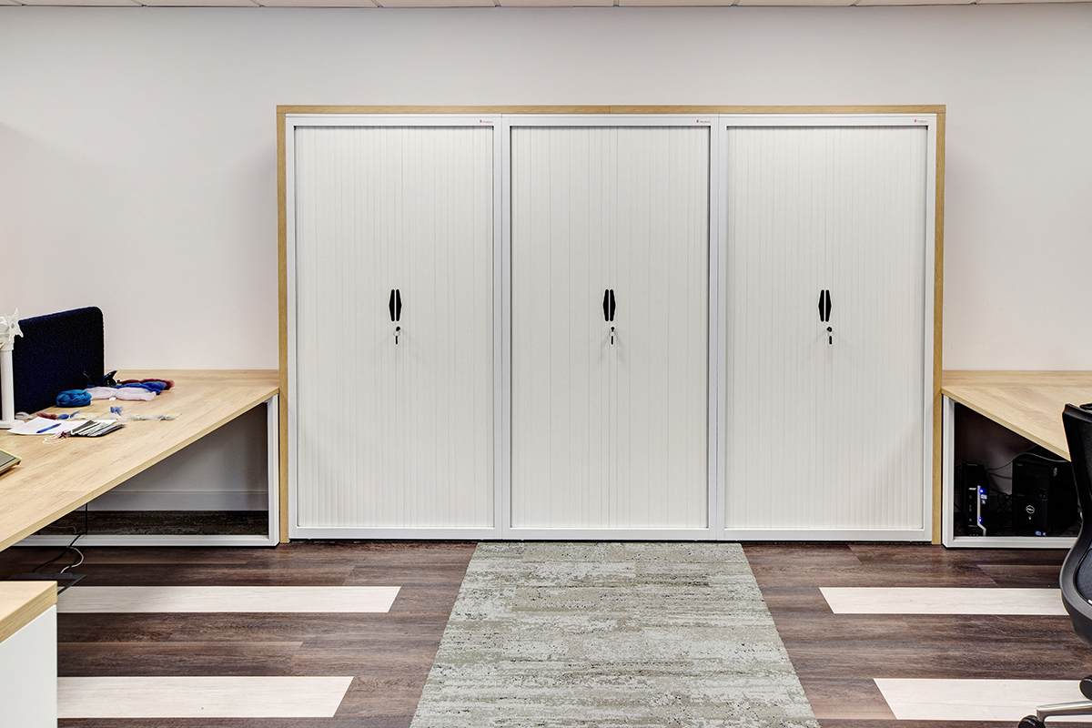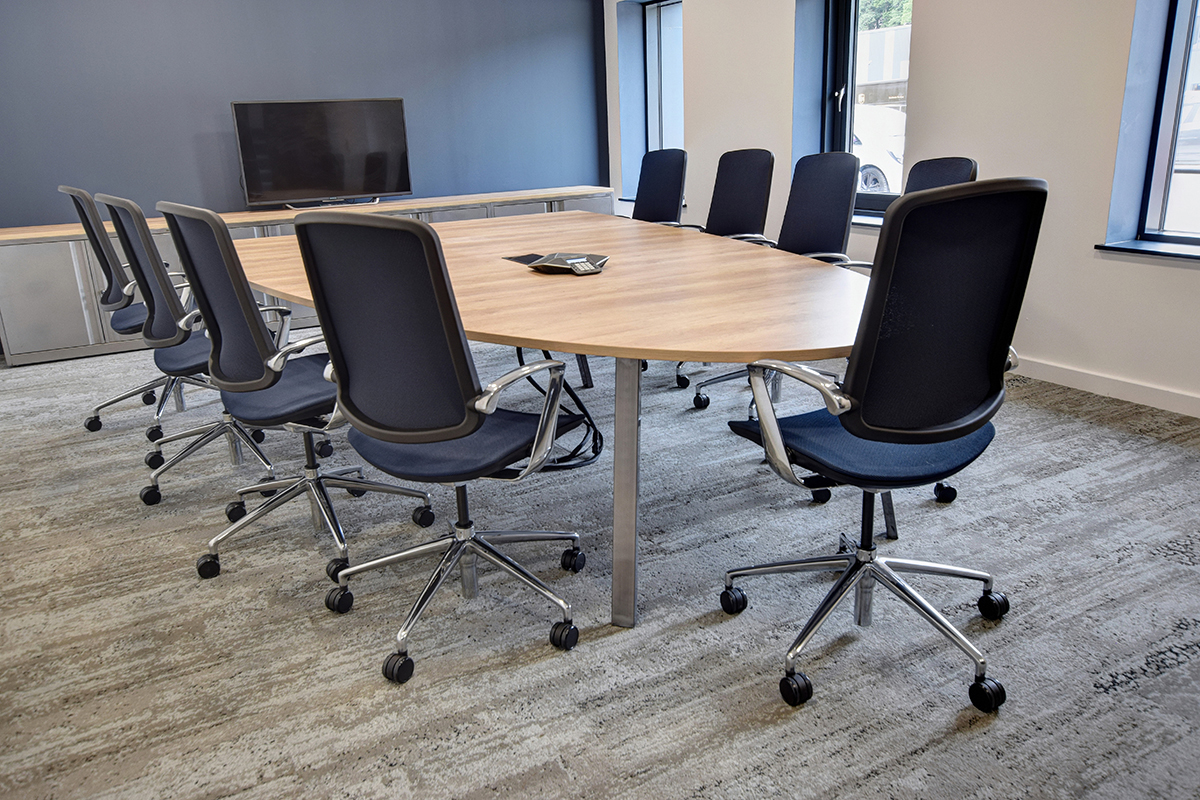 Laxtons are manufacturers of yarn for contract fabric supplier Bute. This manufacturing heritage and tactile yarn features in the interior design with our Ferro clear coat lacquer industrial style storage, managerial desking, breakout areas and boardroom furniture, and their own yarn on the task seating and desk mounted screens. Working with our in-house Design and Engineering departments and Space Planning department, we created a layout and visuals with bespoke boardroom tables and Nebraska Oak laminate cladding our Freestor Tambour Storage. Many of the staff members at Laxtons have expressed how much they enjoy the Tambour storage. The ease and accessibility of the storage units are particularly popular with staff, allowing work to be tidied away at the end of the day. Placed at different angles, in order to improve access, the Flexiform Tambours have made a real difference in this office.