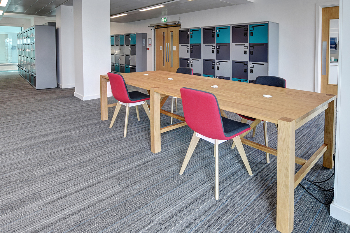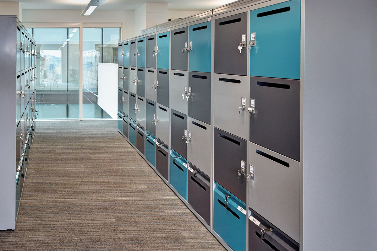 Freestor Office Lockers specified in order to create areas for personal storage, allowing office space to be more freely used to encourage flexible working within the space. Metal lockers are used to help to maintain a clear desk policy, promoting free movement throughout the workspace, allowing staff to work in a variety of different areas around the office.