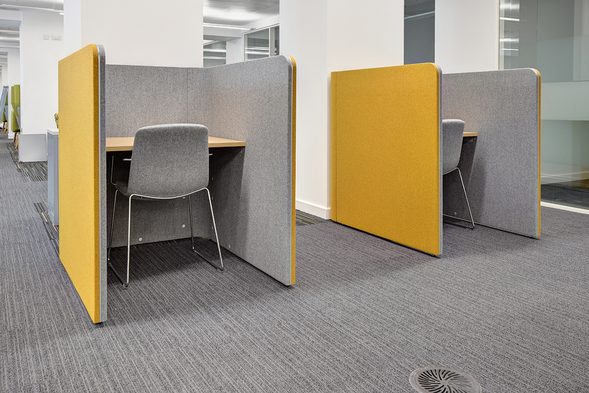 Staff wellbeing is a major factor for all LCC installations with a focus on our Jot-Up sit/stand desk system, along with acoustics, collaborative zones, staff facilities and breakout areas. For desking, our Jot-Up sit/stand desks were used at the end of Pico Back-to-Back Desks with extra high Fyn fabric screens for both privacy and acoustic properties, absorb distracting noise from the open plan offices. Jot-Up is ideal for agile working spaces, helping to promote a healthy, productive workplace which can have a multiple of benefits to your workforce including increased productivity and reduced staff absences.