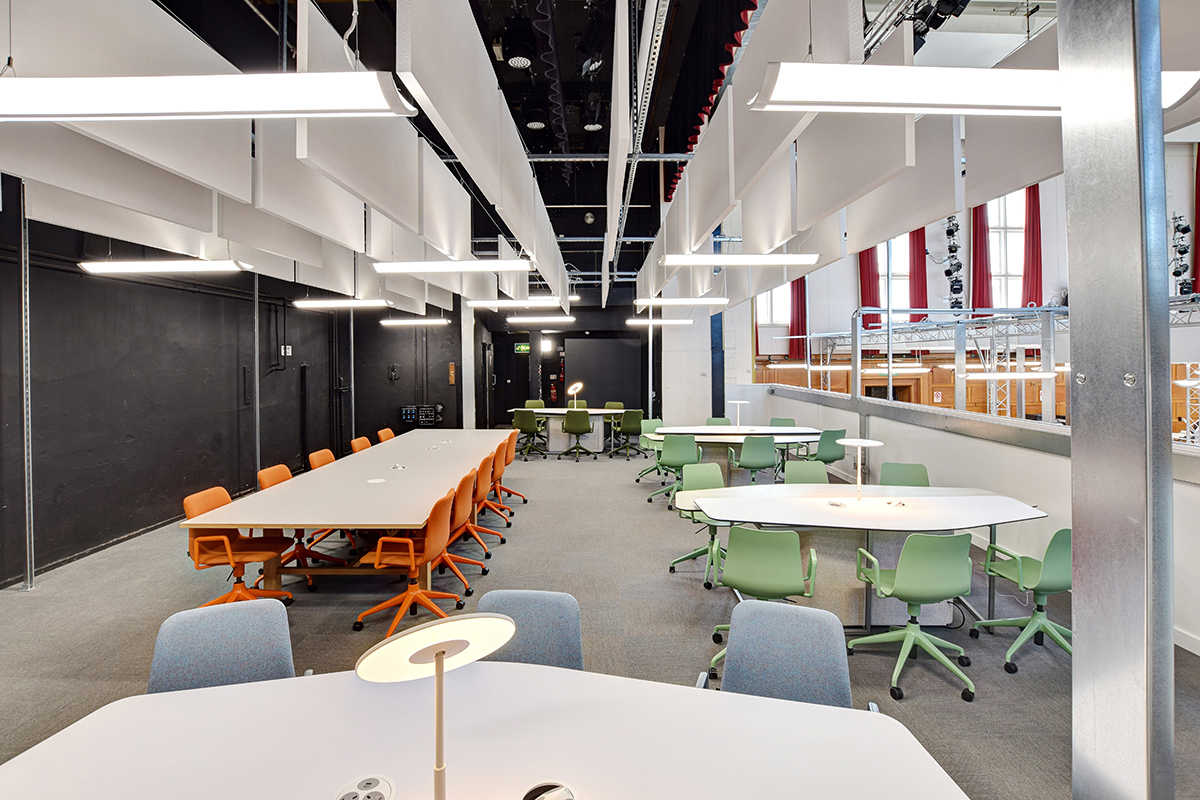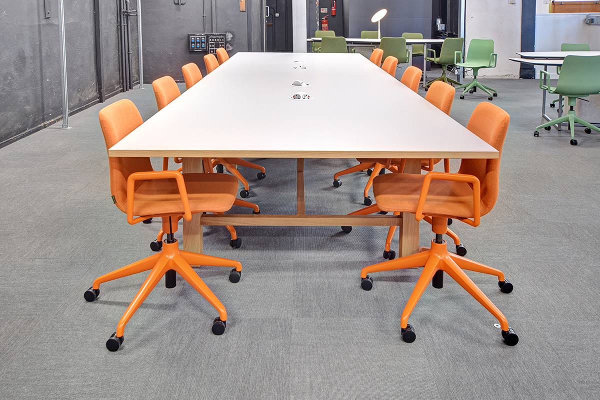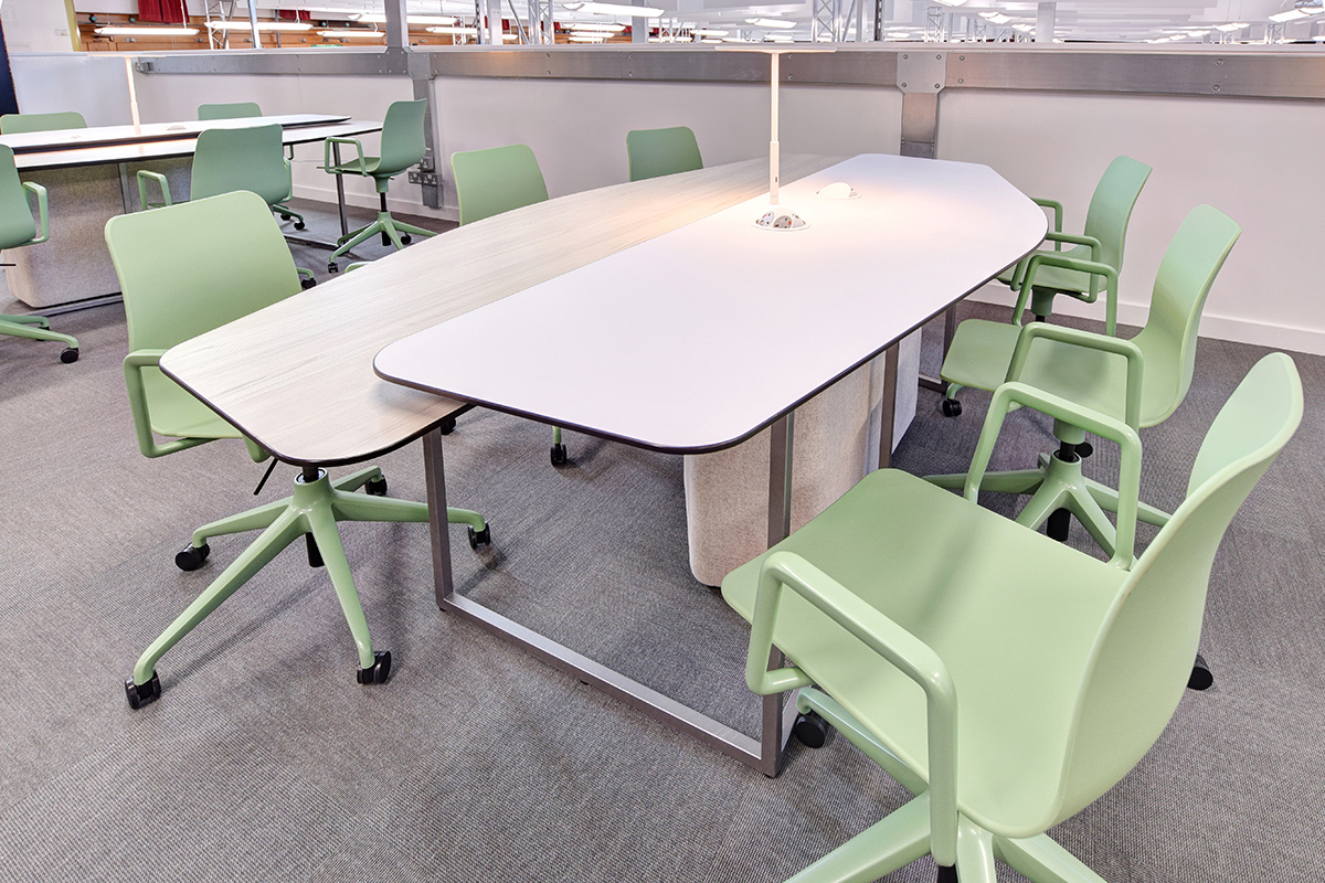 The fixed workspace is more traditional with mesh back task chairs and Flexiform Pico bench desks equipped with monitor arms and on-desk electrics to give a dedicated workspace. To enhance collaboration, the office desks were completed with a central infill tube instead of a desk mounted screen. The use of collaboration tables and light work chairs gives a more flexible workspace where staff can work independently, collaborate and meet, or present. The staff are trialling two collaboration tables; a large solid oak work table with a laminate top, and a split level table with a steel and fabric frame and adjustable task lighting.