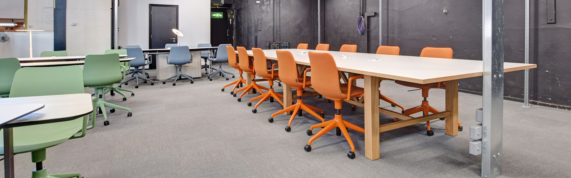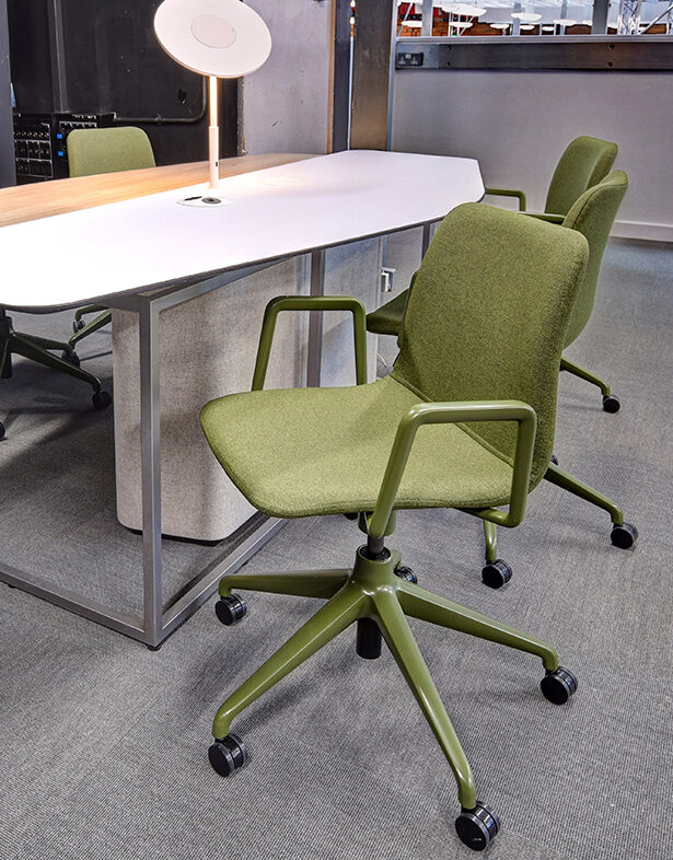 With help from fabric manufacturers and suppliers, the bolder elements of the colour pallet we’re used on the light work chairs, while the mixture of office desks and work tables were more neutral colours. The staff were moving from a complete desk-based office to a 50/50 split of standard back-to-back desks and flexible work tables.