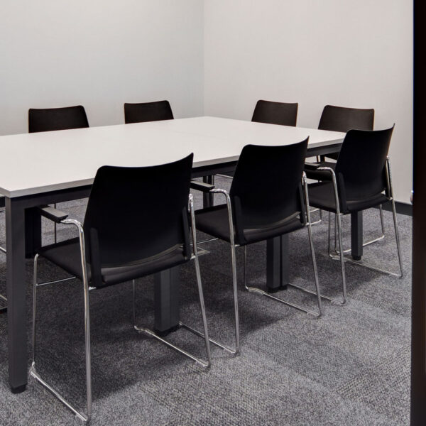 Bespoke laptop, phone and equipment charging lockers were designed to suit the client’s requirements to include concealed power and a USB charging station. These metal lockers are fully ventilated and can charge two laptops, mobile phones and other equipment in one compartment. These uniquely designed lockers feature a cam lock, locker number, three-quarter shelf (to access the power module at the rear), and an extra equipment storage holder behind the door. The breakout canteen area comprises our Additions Pedestal based tables, Additions Pedestal square-based tables and Additions Double Pedestal tables surrounded by chrome wired chairs, as well as poseur height tables and stools.