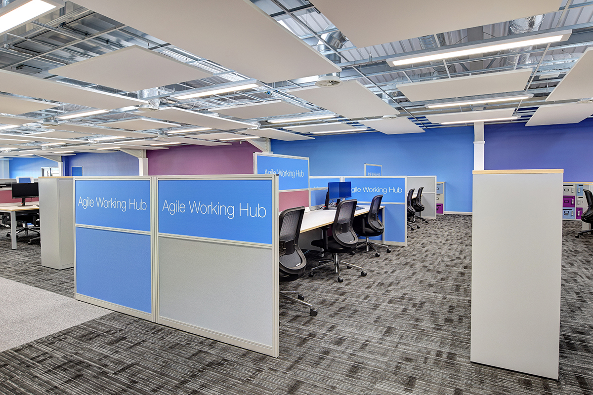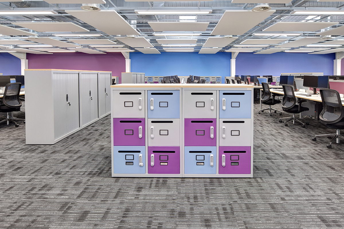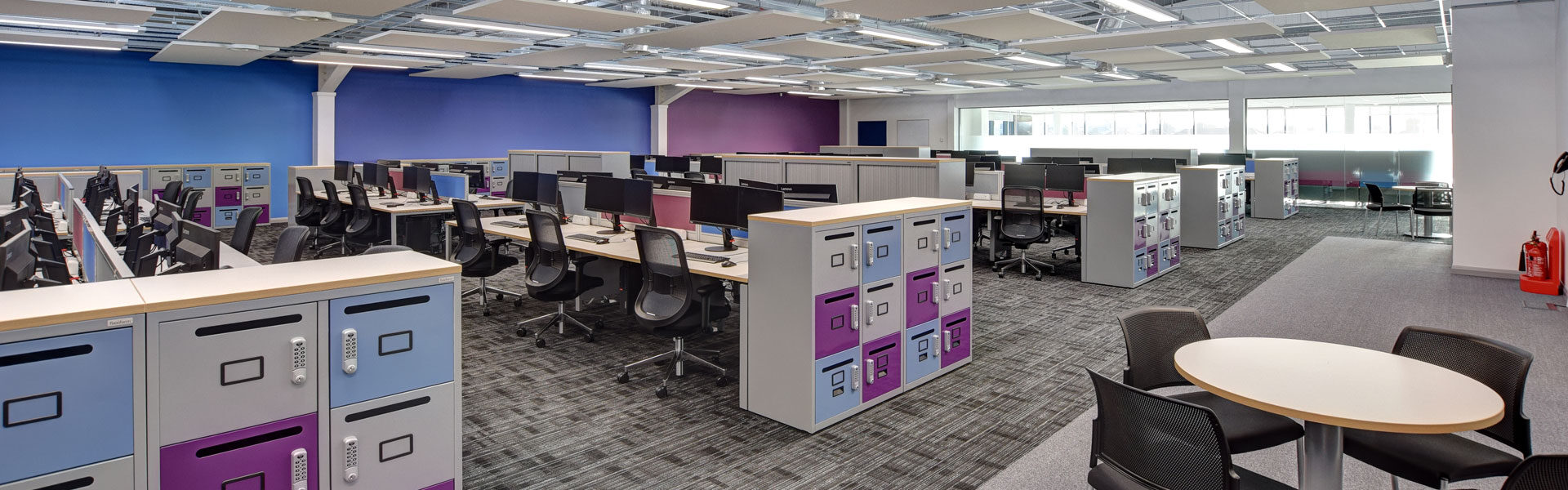 Flexiform has recently completed the design, manufacture and supply & installation of contemporary office desks, breakout seating and office storage products for this Major Blue Light Facility. The client received several tailored Flexiform services including detailed storage surveys carried out at the client’s existing office/department locations which were moving to this new facility. This survey allows us to understand how many linear metres of storage a client needs. Other services include Level 2 BIM compliant Space Planning Services from our CRB checked team, plus a number of visuals to aid their design process. Our Space Planning team worked alongside the client, Facilities Managers and Contractors to make amendments to the shared Revit Building Model. Our in-house Design and Engineering team also designed a number of bespoke items including specific tailored charging lockers to include removable split level trays and inbuilt power and USB charging. Special height screens, with tailored graphics designed and applied, were used for specific working groups.