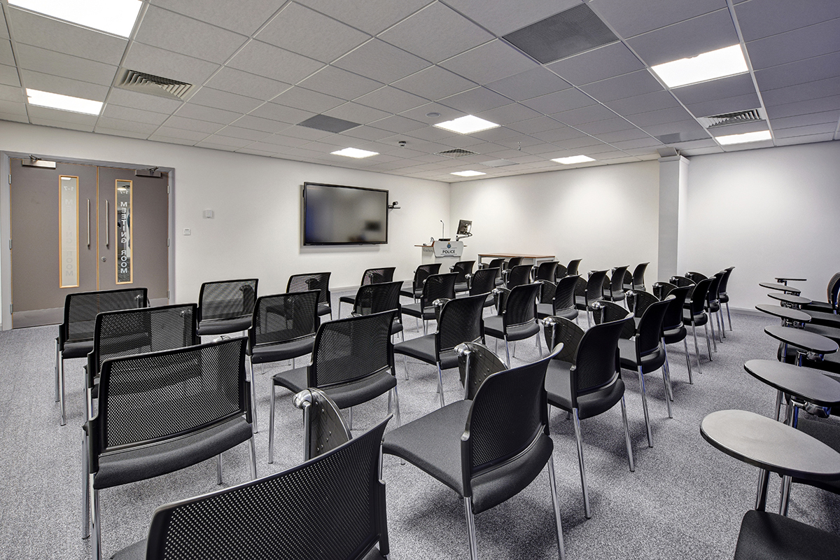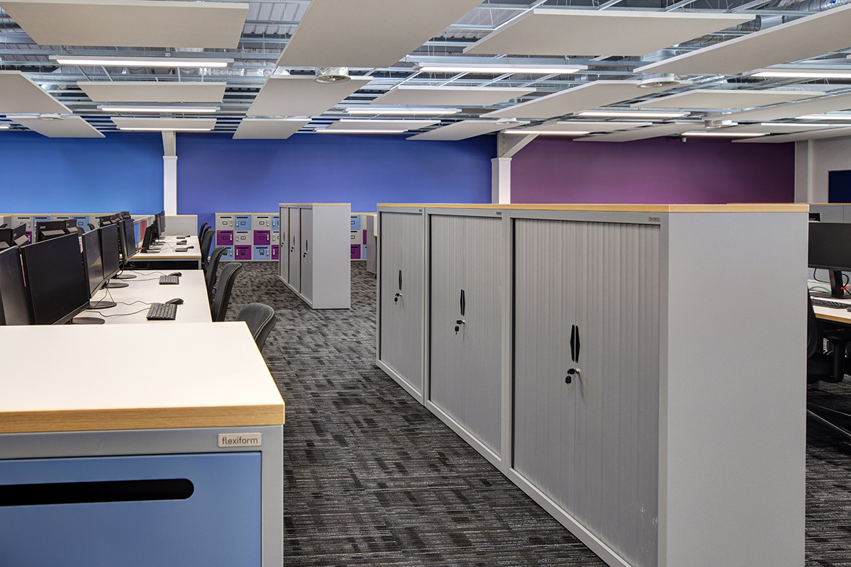 The chairs are in line with the colour scheme provided by this Blue Light Facility. Modular sofas are available in this space with built-in power and data. The meeting rooms house our Additions V Flip-Top tables including inset power modules with HDMI. In some rooms we have supplied our low Freestor Ventilated Tambour storage units, being used as a credenza for electrical equipment for TV presentations and general storage.