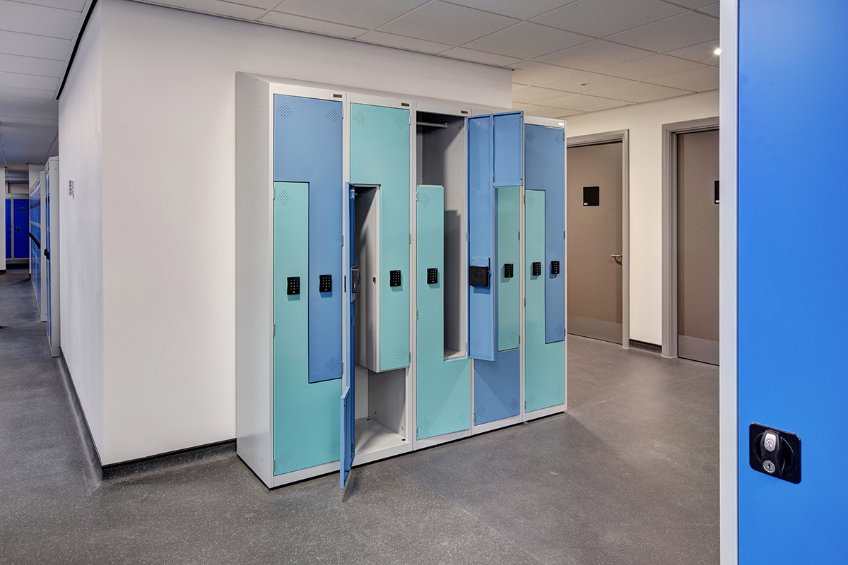 There is a range of lockers installed in this Blue Light Facility for a number of different uses, including our Freestor Accent office lockers with bespoke colour combinations and high-security DC Locks. These metal lockers can be found in the main office for personal items and work-related storage. Additionally, we adapted our standard metal lockers for coats and other personal belongings to meet the client’s requirements. The bespoke changing room lockers feature a new ventilation system help to keep clothing fresh, whilst sloped tops discourage staff from storing any items on the top of the lockers. Locker numbers have been added for personalisation and accurate allocation, and a cam lock to ensure items are safely stored away.