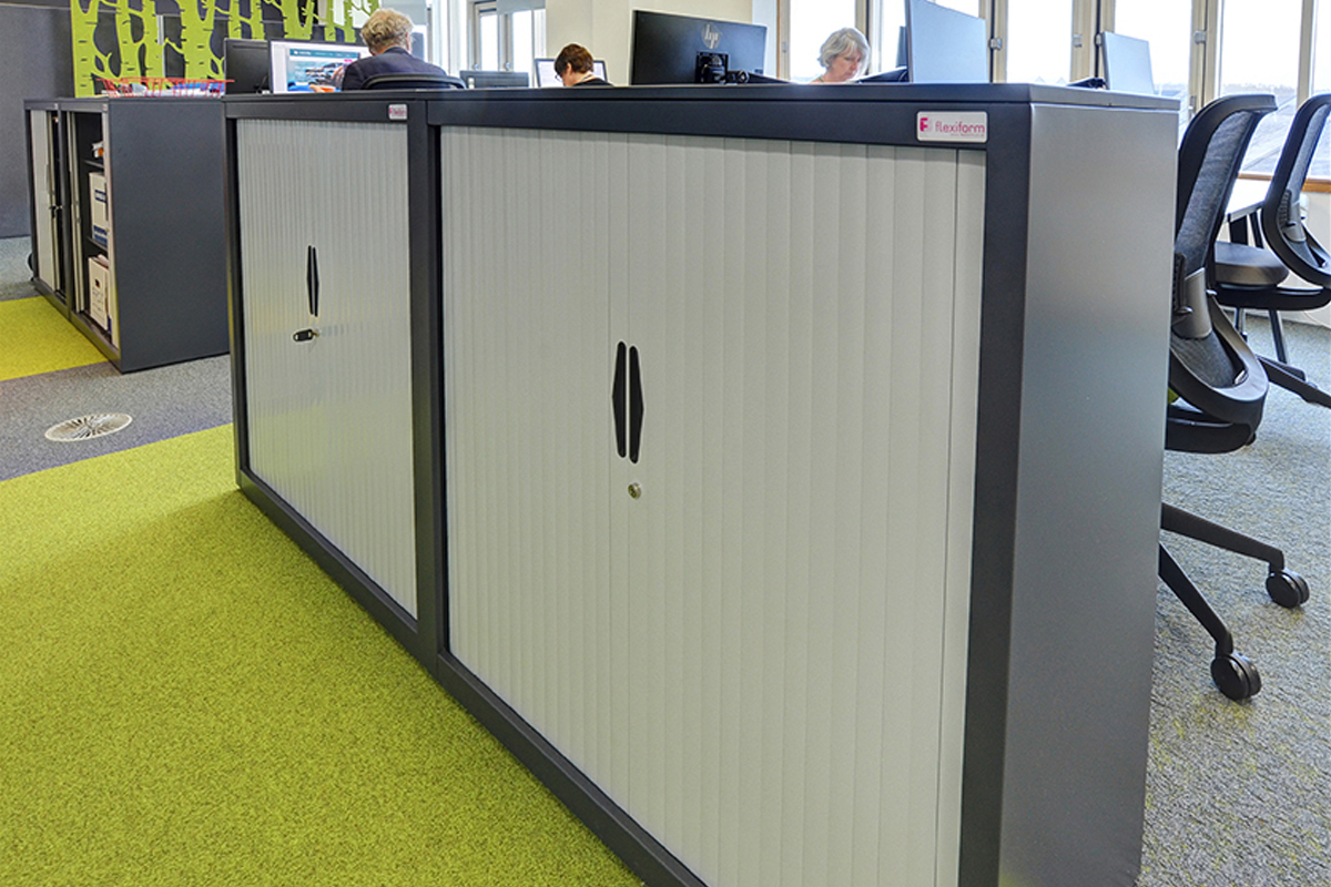 The workstations are made up of our Jot-Up Sit/Stand Desks and Pico Back-to-Back Bench Desks with task chairs. Every other bank of desks has sit/standing desks, boasting bespoke coloured infill strips and discs, following the colour scheme of the office. Each individual workstation has cable management so they can move independently of each other. These desks allow movement throughout the day, improving physical and mental health. The Pico bench desks have contrasting infill tubes instead of a desk mounted screen which allows it to be more open and social. Our Freestor Tambours with a contrasting carcass, shutter doors and metal tops have also been placed at the end of each workstation, providing a maximum storage solution without taking too much floor space.