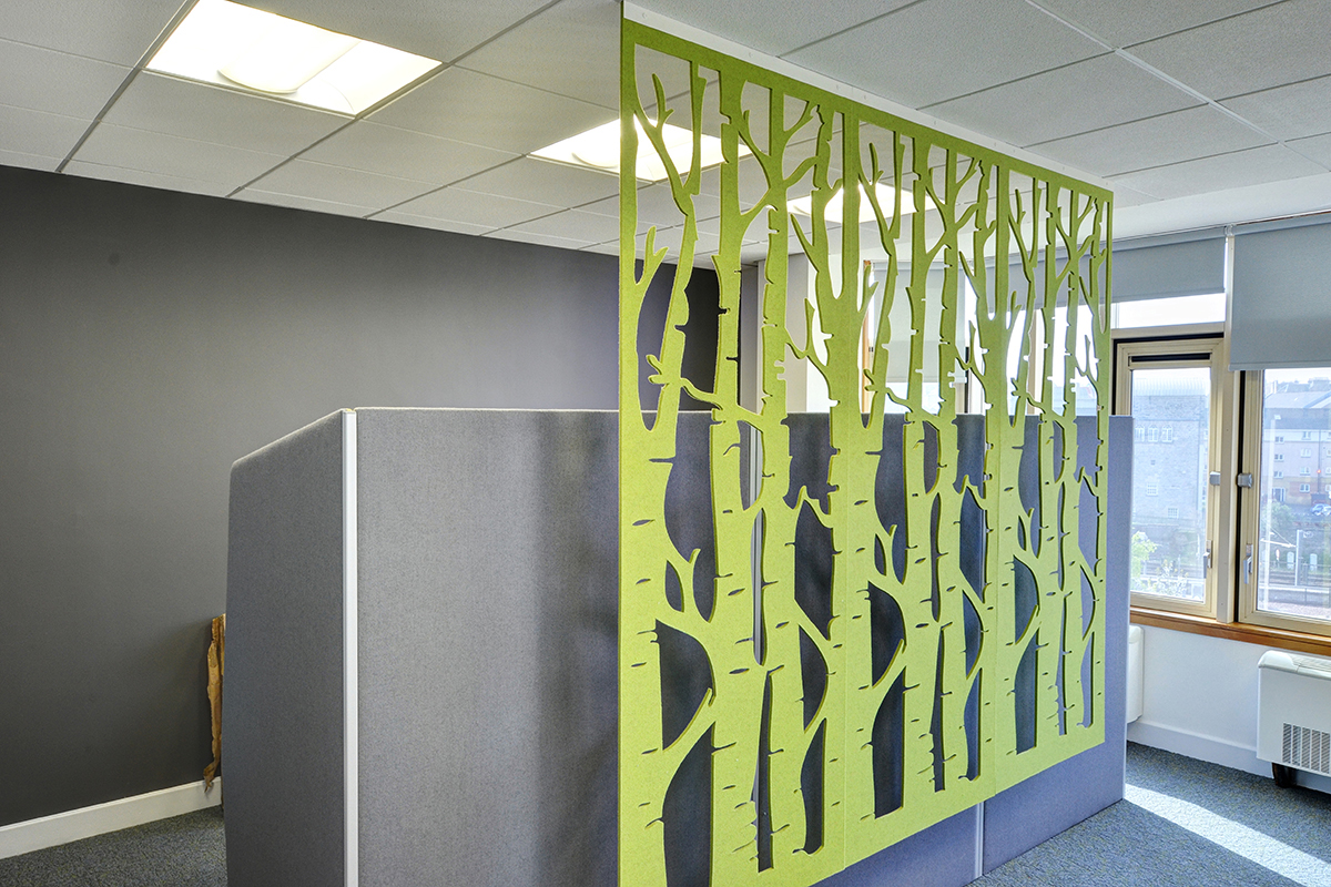 Acoustic suspended panels surround the collaborative and quiet working areas, improving wellbeing and productivity, as well as reducing any distracting sounds from other parts of the office. The office boasts a beautiful Birch Falls Tree Design which has been imprinted on the glass. This alongside our planters on every other bank of cupboards has been influenced by biophilic trends and wellbeing.