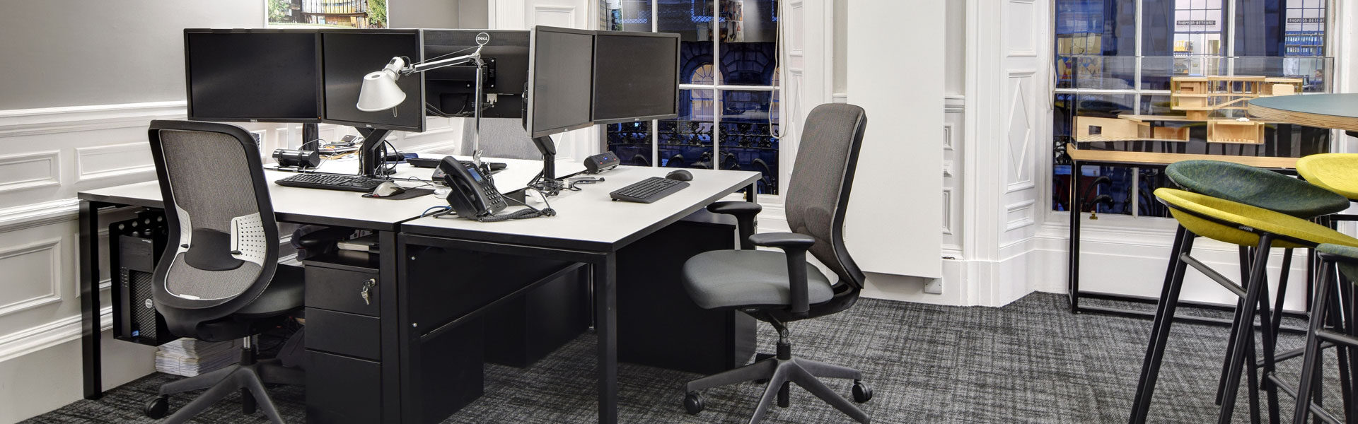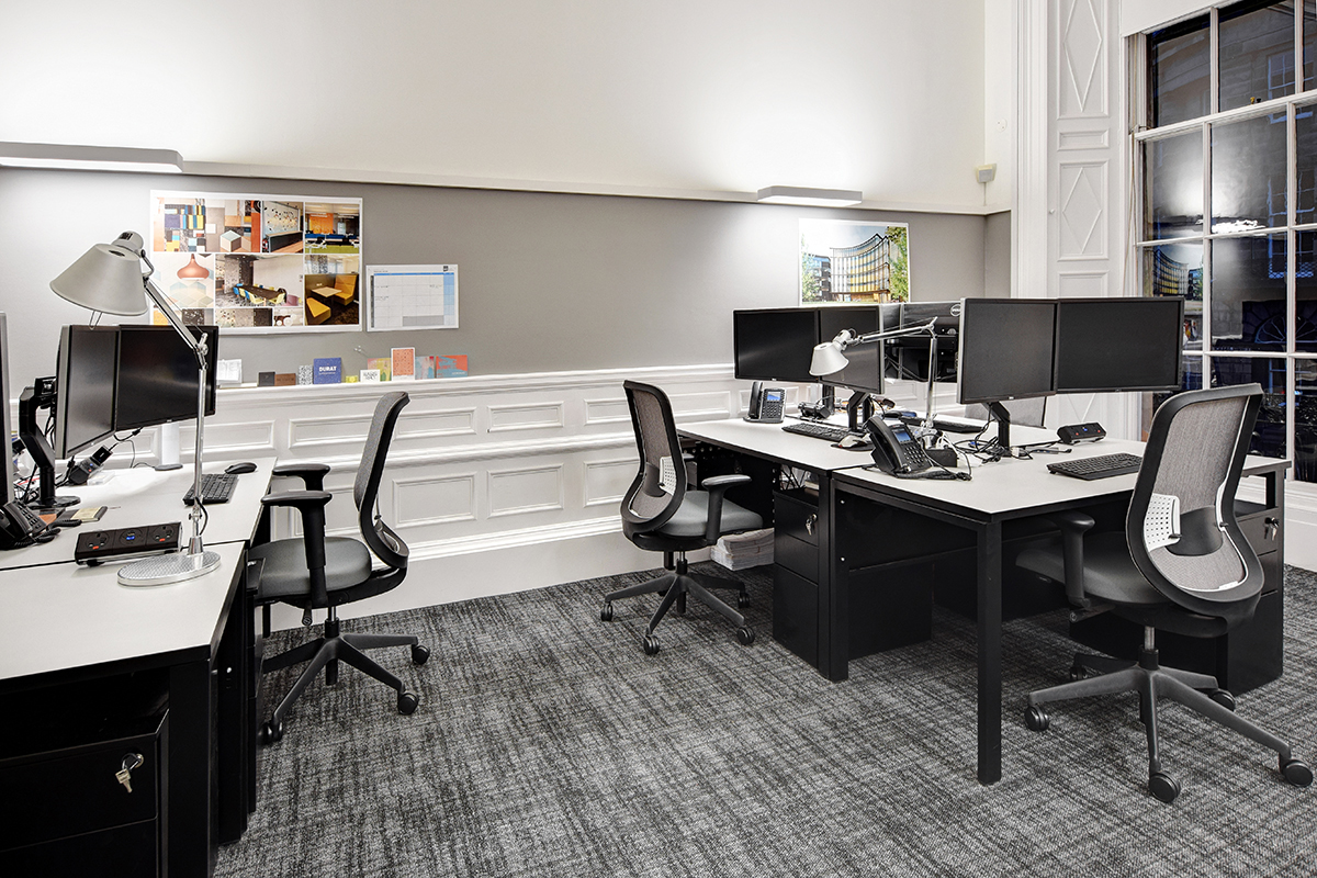 MLA designed the office interior using their own in-house design team, selecting Flexiform products to support their new workspace. Our Pico desks were installed throughout all floors in single, back-to-back and side-to-side configurations with black metal framework and contrasting white tops with black edging. We manufactured the desks to a special depth to provide the best use of available space in their ex-townhouse Georgian building.