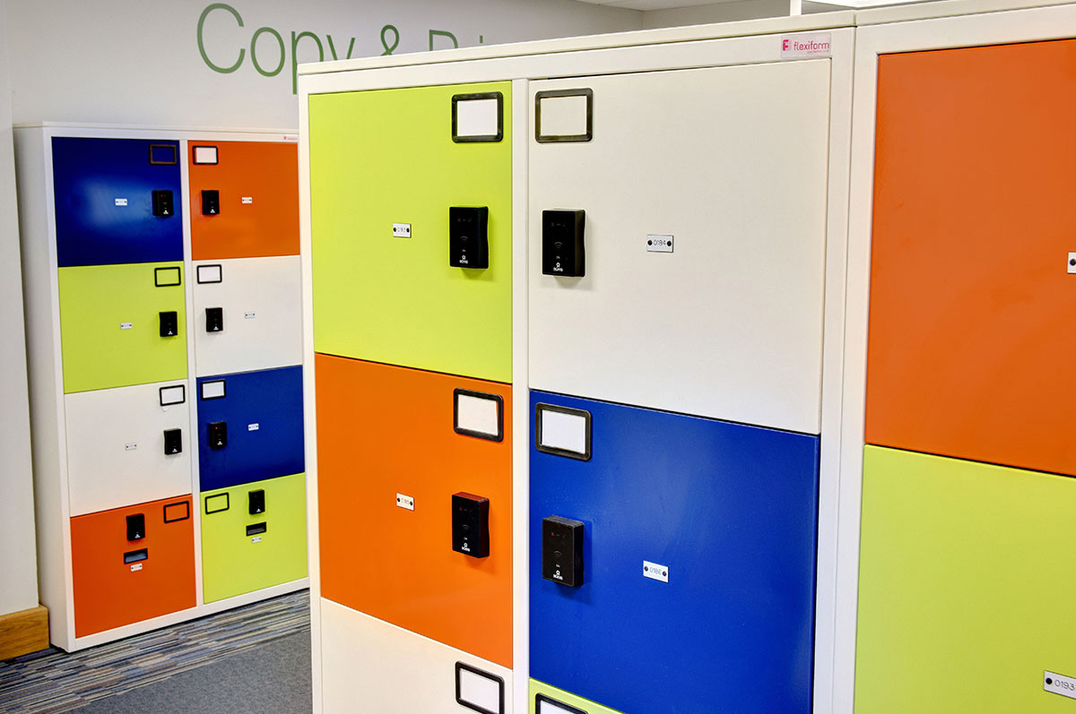 As floor space had become a real problem we needed to be creative. We moved from the proposed locker configurations to taller units (1742mm 8 door locker units, and 2150mm 10 door locker units) which had similar layouts to the original proposal, i.e. with 2 drawers at the bottom. These units were used to create soft space on one floor, necessitating the use of fabric back panels, which were attached with magnets. This proved to be very successful. We also decided to fit Oak MFC tops on the lower units, as these would now be integrated with the existing similarly equipped units.