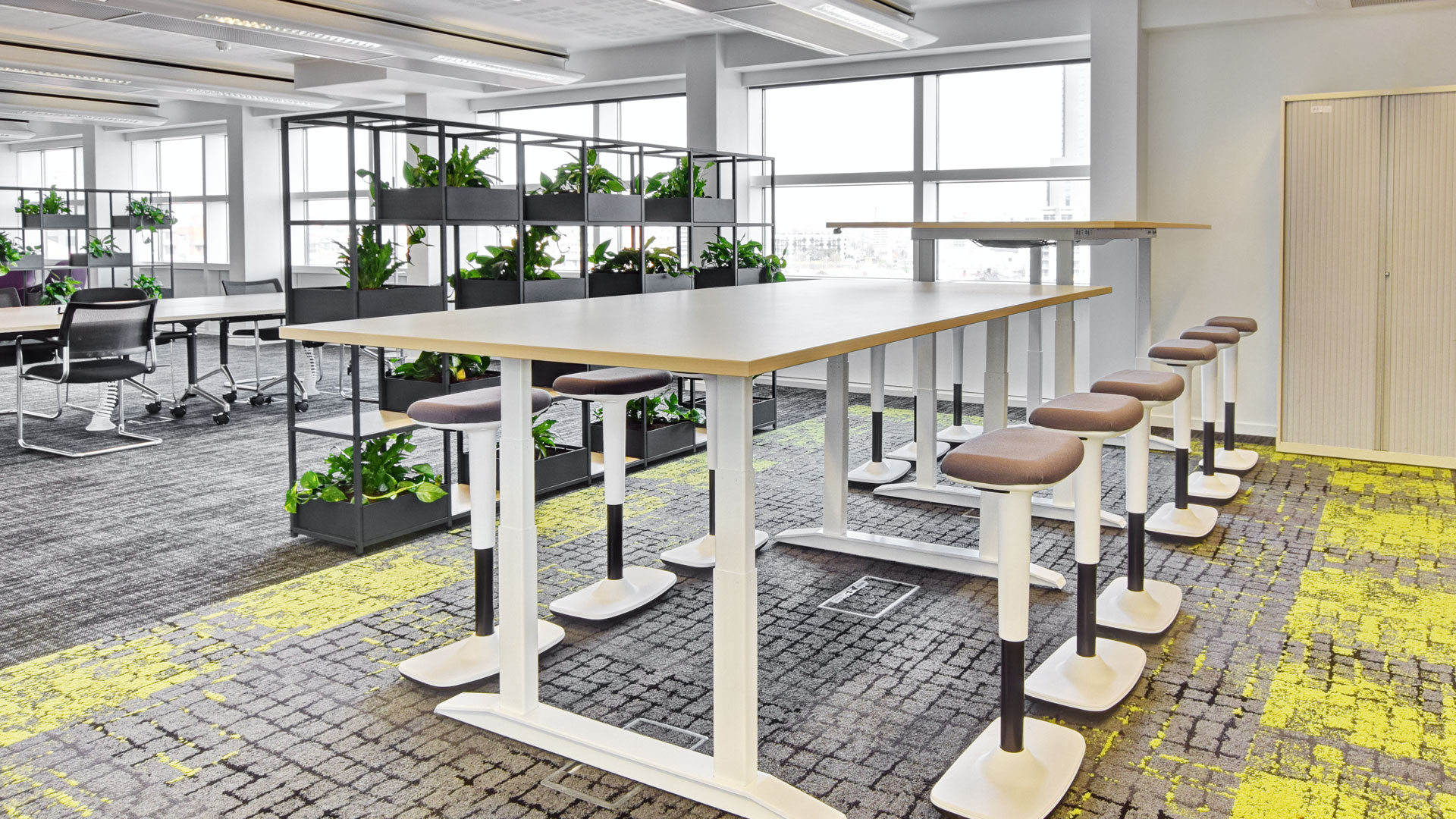 Flexiform has completed the installation of collaboration and meeting furniture for National Highways, Preston. Revisiting our 2016/2017 office furniture installation featuring desking, business storage, personal storage lockers, traditional meeting room furniture, and a basic canteen, National Highways wanted a refresh of the workspace to accommodate post-Covid-19, new ways of working and a hybrid workforce.