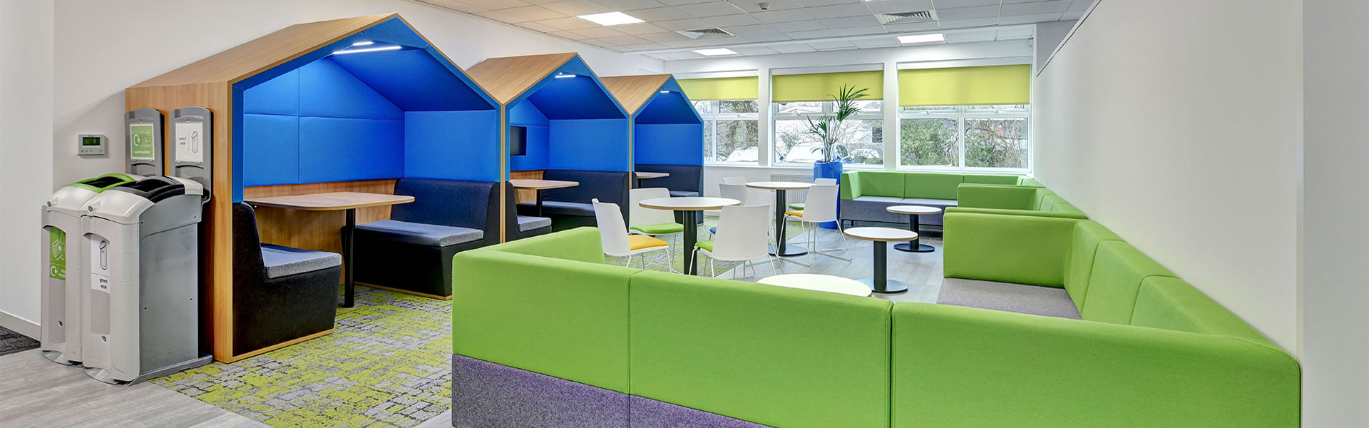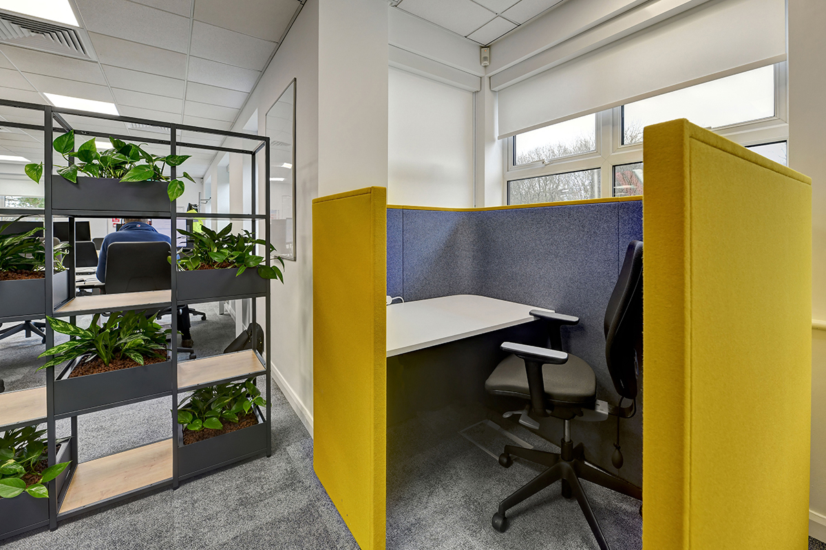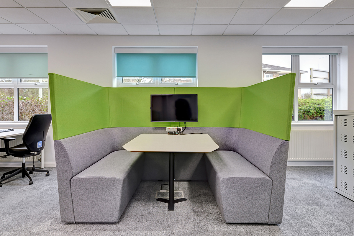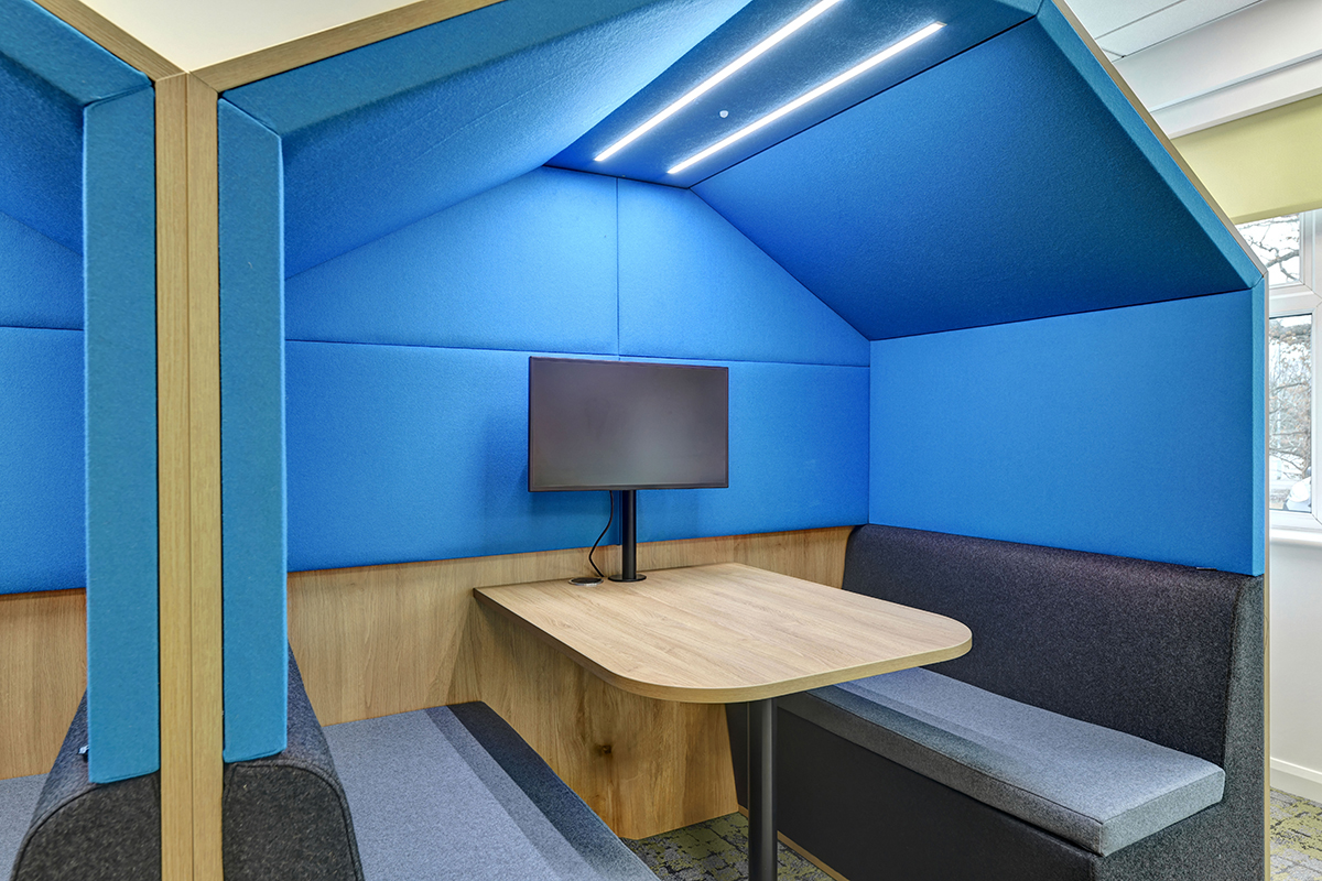 To provide a private meeting space, Flexiform installed the Bob enclosed acoustic pods with built-in seating, media facilities, power, electrics, PIR lighting and a quiet ventilation system. These office pods are ideal for private meetings, 1-2-1 and video calls, offering a comfortable meeting space. In addition to meeting pods, Flexiform also installed single work booths, allowing staff a private space to focus on their work. Flexiform is delighted to revisit and modernise this office space with up-to-date working practices and looks forward to continuing our work with National Highways.