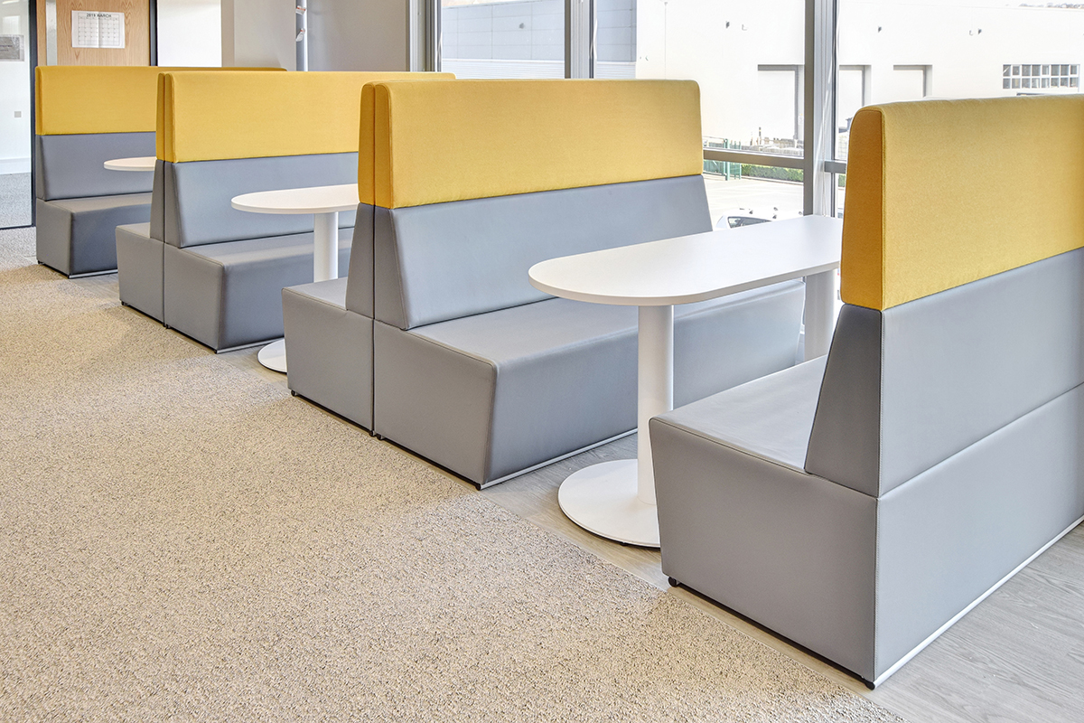 For the Boardroom we designed and manufactured a bespoke Additions 2 table complete with a central cut-out feature to allow easily accessible cable management, finished with our chrome A3 (triangular legs). In the breakout and collaboration areas the client chose a range of banquette seating and meeting booths to provide a stunning complement to the office space and provide away from the desk work areas featuring with grey and yellow accents.